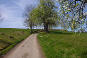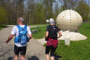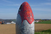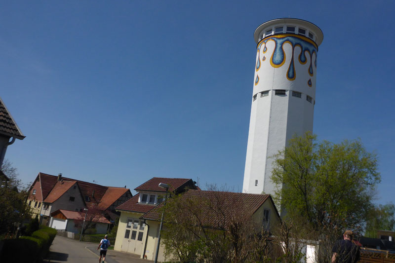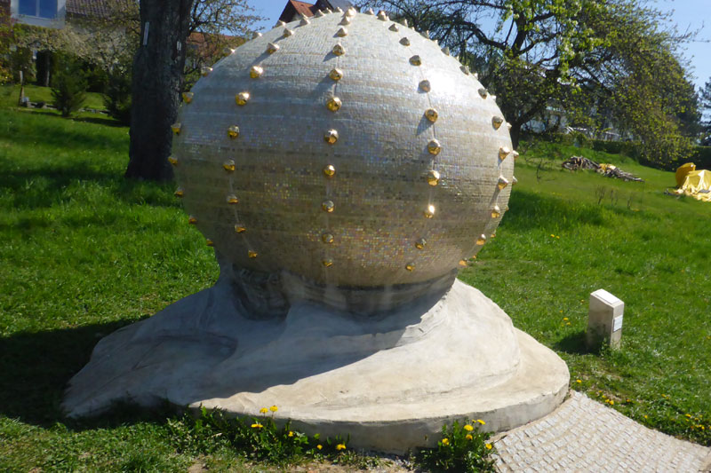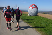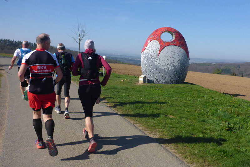 Natürlich gibt es virtuell keine vorgegebene Startzeit, mit dem Überlaufen der Matte geht’s unspektakulär los. Der Lichtenwalder Höhenweg führt uns nach 700 Metern in den Ortsteil Hegenlohe, wo normalerweise die Rennen gestartet werden. Nur kurz tangieren wir das Wohnviertel. Wenig später passieren wir die Eiförmige Skulptur „Augenblick“, sie soll mit dem glitzernden Fenster zur Alb hin Naturverbundenheit und Fernweh symbolisieren. Auch ohne den Blick durch das Loch des Kunstwerks können wir eindrucksvoll unter einem weiten blauen Himmel die Kaiserberge im Süden genießen.