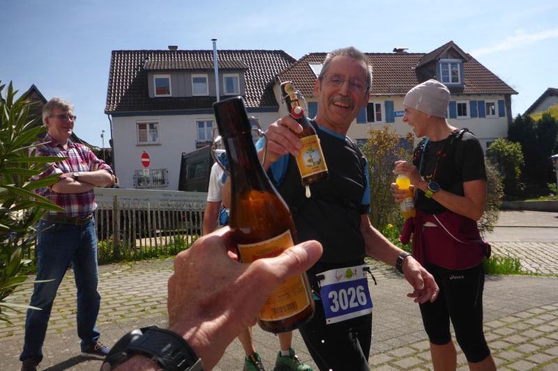 Während die kürzeren Strecken bereits seit 20 Jahren hier gelaufen werden, feierte der Schurwald Marathon erst 2017 seine Premiere. Ganz einfach ist der Marathon nicht, zu den 42,2 km (virtuell-bedingt heuer 43 km) müssen auch 700 Höhenmeter bewältigt werden. Offiziell heißt er im Übrigen seit seiner zweiten Auflage „Fensterbau Roos Marathon“. Natürlich rein zufällig treffen wir mit Kati und den „3Assen“ einige unserer Freunde aus dem Großraum Stuttgart, die allesamt natürlich bei den „Local Heros“ gemeldet sind und dieses Wochenende nicht zum ersten Mal hier sind. Im Übrigen sind alle in dieser Woche schon negativ getestet worden und mit etwas Abstand sollte somit bezgl. Corona kein Problem entstehen, insbesondere da ja mittlerweile bekannt ist, dass die Aerosole im Freien kaum eine Rolle bei den Infektionen spielen.