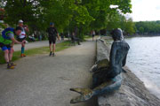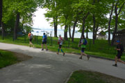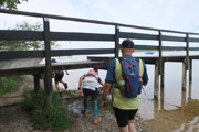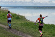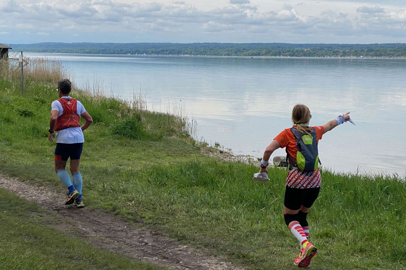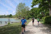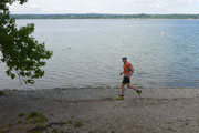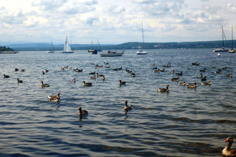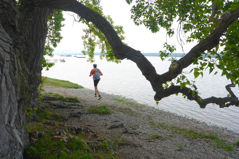 Auf was warten? Alle sind fertig und voller Vorfreude, so kann ich um 9.55 Uhr das Startkommando geben. Im Gegensatz zur Premiere im Vorjahr starten wir heuer im Uhrzeigersinn, zuerst also Richtung Herrsching am Ostufer entlang. Der Grund hierfür liegt an den anspruchsvolleren Trails, die wir lieber bereits zu Beginn absolvieren und auch richtig genießen wollen – noch im Vollbesitz aller Kräfte. Nach zweihundert Metern auf der Landsberger Straße, vorbei am berühmten Restaurant Fischer mit Strandbar und Biergarten, wechseln wir auch bereits an den Uferbereich des Ammersees, den momentan einzig eine große Kolonie Graugänse bevölkert.