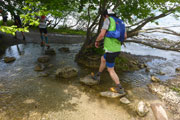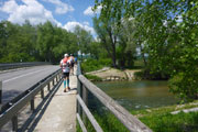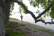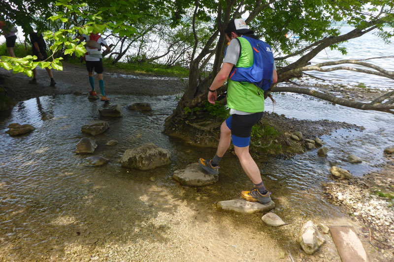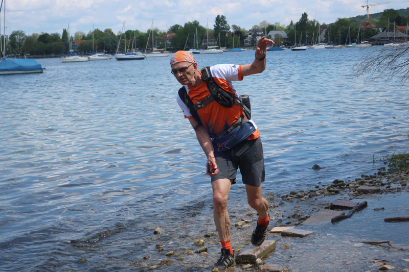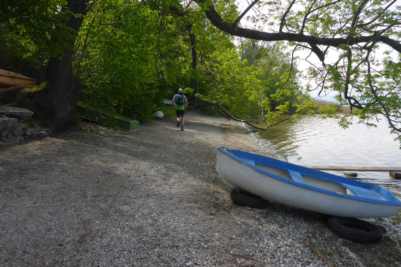 Nach etwa 4 km mit etwas mehr Trubel sind wir durch (km 14) und wieder auf einem Naturweg weitestgehend alleine unterwegs. Ein paar schöne Balanceübungen über Wasserläufe, die mit Steinen ausgelegt sind, gibt es zu bewältigen, um nicht nasse Füße zu bekommen. Wunderschöne Aussichten auf den See mit Alpenpanorama bieten sich uns bis kurz vor Fischen.