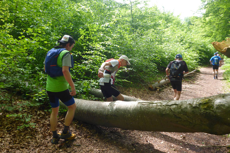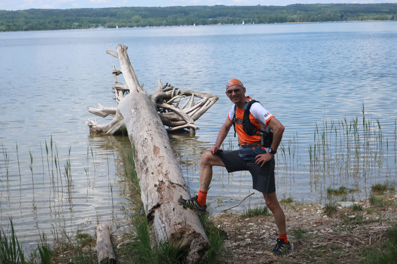 Nach einem Kilometer sind auch einige Höhenmeter über den Siebenbrückenweg durch den Wald zu bewältigen, ein beliebter Spazierweg von Ammersee Besuchern. Unmittelbar danach wechseln wir aber an den Uferbereich. Praktisch an der Wasserkante entlang schlängelt sich ein herrlicher Singletrail, immer wieder unterbrochen von Strandabschnitten über Kies am Ufer entlang. Bereits nach den ersten Kilometern wird klar, dass unsere vorgenommene Richtungsänderung ein Hammer ist. Der stetige Wechsel von Trails und Strandabschnitten mit wunderschöner Aussicht über den See ist traumhaft. Im Vorjahr mussten wir noch des Öfteren einen Slalom mit Badegästen austragen, heute behindert uns bis auf ein paar vereinzelte Gassigänger niemand.