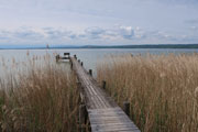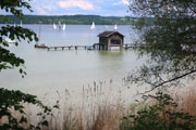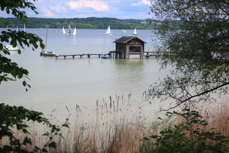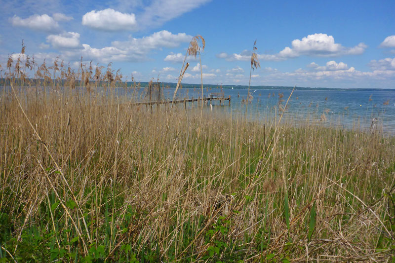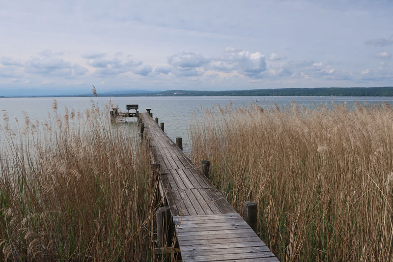 Ganz anders als das Ostufer ist die Wegbeschaffenheit des Westufers. Trails bekommen wir nicht mehr unter die Füße. Meist geht es auf der schmalen Seestraße oder Naturwegen, fast immer geradeaus zurück Richtung Stegen. Parallel zum Weg liegt anfangs auch das einspurige Gleis der Bayerischen Regiobahn (BRB). Leider halten sich auf dieser Seite auch die Ausblicke auf den See in Grenzen.