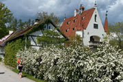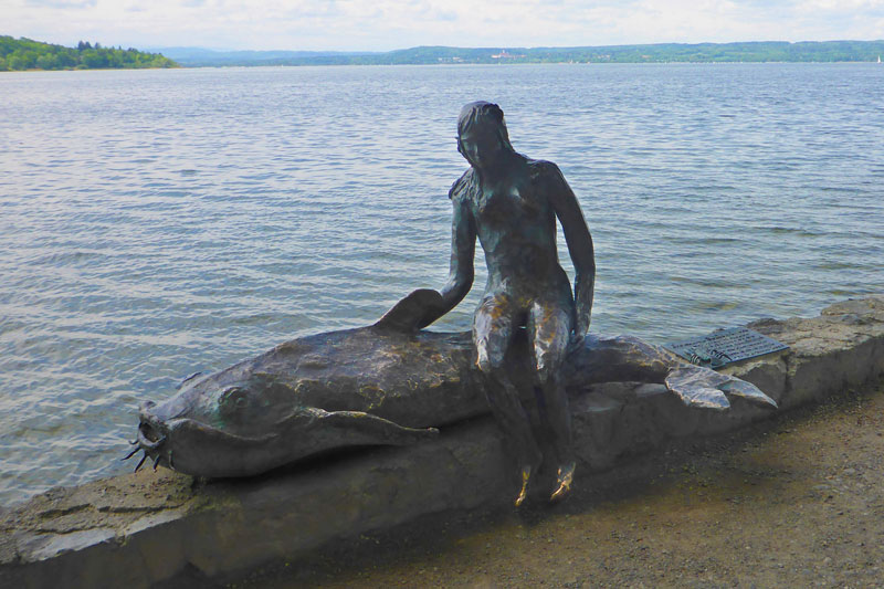 Durch den Kurpark gelangen wir zur Kleinen Seejungfrau, die auf einem Waller sitzend darauf wartet, beachtet zu werden. Wir nehmen uns Zeit für sie und machen gleich eine Fotosession mit ihr. Die Bronzeskulptur war 2005 ein Geschenk einer Bildhauerin an die Gemeinde Herrsching. Dann geht’s vorbei am Kurparkschlösschen mit seinen pittoresken Erkern und Balkonen, es ist eines der Wahrzeichen von Herrsching. Seit 1934 ist die einstige Villa des Kunstmalers Ludwig Scheuermann, der 1888 das ganze Areal des heutigen Kurparks erwarb im Besitz der Gemeinde Herrsching. Zahlreiche Feste, Konzerte und Kunstausstellungen finden in den Sommermonaten hier statt, auch heute steht ein Musiker am Eingang und gibt sein Bestes. Im Kurparkschlössl kann man sich auch trauen lassen.