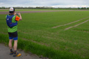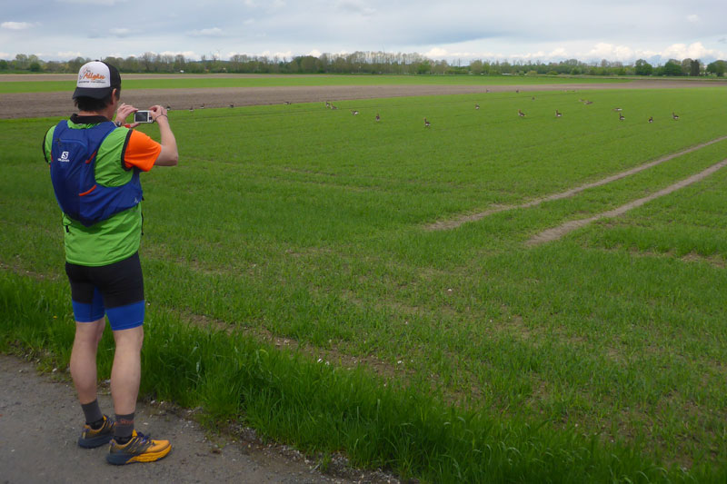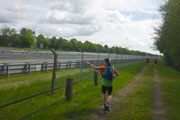 Wir laufen die ersten Kilometer unterhalb des Speicherseedamms an Feldern entlang, hier hat sich eine riesige Kolonie von Graugänsen niedergelassen. Nach zwei Kilometern erreichen wir das BMW-Messgelände Aschheim mit Teststrecke. Der Weg unterhalb des Damms war früher einer der beliebtesten Schleichwege der Ismaninger und Aschheimer. BMW sperrte aufgrund des hohen Verkehrsaufkommens 2010 die Privatstraße entlang der Teststrecke, die ins Finsinger Moos führt. Vor allem objektive Lärmmessungen waren aufgrund des Krachs durch den ständig zunehmenden Schleichverkehr problematisch. Unter der Woche ist meistens auch das Tor für Fußgänger geschlossen. Andreas hat nachgefragt, am Wochenende ist das Tor offen und man darf entlang der Teststrecke laufen.