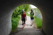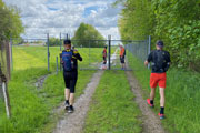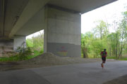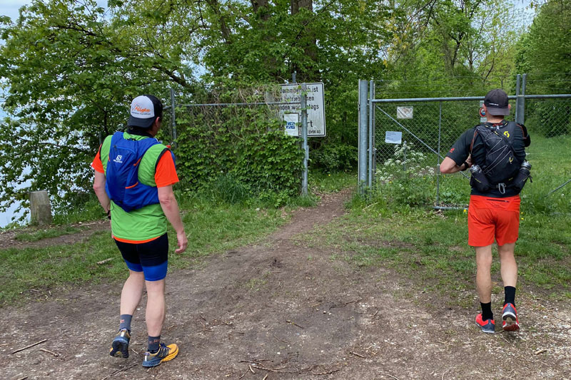 Durch einen Tunnel unter der B471 gelangen wir an den Mittleren Isar-Kanal. Die Schranke davor hat Andreas als unser Ziel festgelegt, hier wird unsere Marathondistanz erreicht sein und sogar um 300 Meter überschritten. Theoretisch natürlich, den gesamten Kurs ist ja noch keiner gelaufen, sondern wurde nur per Software geplant. Ich bin gespannt, wie genau das Tool funktioniert.