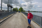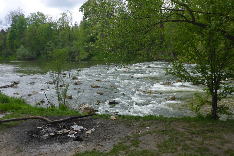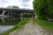 Am Oberföhringer Stauwehr ist unser südlichster Streckenpunkt erreicht. Nach erneutem Seitenwechsel geht es zurück. Am Wehr habe ich auf Udo aufgeschlossen und überquere nach ihm die Wehranlage. Auf der gegenüberliegenden Seite ist der Beginn des Mittlere Isar-Kanals, hier wird er von der Isar abgeleitet, läuft noch einige Kilometer parallel zum Fluss und zweigt nördlich von Unterföhring nach Osten ab. Nach wenigen Kilometern fließt er dann in den Ismaninger Speichersee und weiter durchs Erdinger Moos. Schließlich mündet der ausschließlich der Elektrizitätserzeugung dienende Kanal östlich von Moosburg wieder in das natürliche Flussbett der Isar ein. 1921 begann man mit dem Bau, 1929 wurde er beendet. Es entstanden fünf Kraftwerke, für regelmäßige Wassermengen sorgt der Speichersee.
