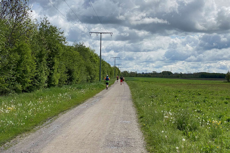 Für uns Nicht-Münchner liegt der Startplatz diesmal äußerst günstig, einen Kilometer von der Ausfahrt Aschheim/Ismaning an der A99. Nicht einmal 45 Minuten benötigen Charly und ich, um den Parkplatz am Speichersee zu erreichen. Greppi und Thomas sind bereits da, Andreas und Judith kommen etwas pünktlicher. Wir haben uns auf einen Start um 10 Uhr geeinigt, Andreas zählt runter, unsere GPS laufen und los geht‘s. Später soll noch Udo folgen, der auch immer auf der Suche nach geeigneten Läufen in Corona-Zeiten ist und im Runners World-Forum mit Andreas in Kontakt kam.