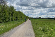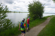 Nach 6 km geht es rauf zum See. Wir überqueren den Speichersee mittendurch auf einem Damm, der ihn in einen West- und einen Ostteil trennt. Der künstlich geschaffene See wurde 1928 geflutet und bietet Naturfreunden vor allem zahllose Wasservögel, wenn sie sich nicht gerade unten auf den Felden aufhalten. Am Ende des Damms biegen wir nach links ab Richtung Neufinsing. Leider müssen wir uns mit einer Schotterstraße begnügen, von der man keine Einsicht auf den See hat. Es gäbe eine Alternative direkt am Seeufer entlang, da müssten wir aber verbotenerweise über einen Zaun klettern. Klaus hat’s bei seiner Umrundung durchgezogen, wir verzichten aber darauf.