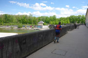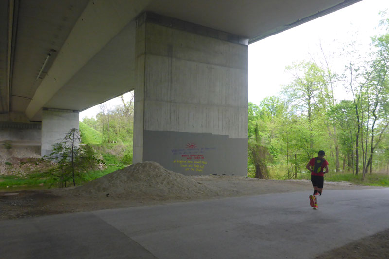 Der Aufstieg ist für uns immer eine Sackgasse, nur für diese Aussicht eingebaut, einmal den Blick genießen und schon geht es wieder runter. Ein Richtungswechsel lässt uns für zwei Kilometer wieder nordwärts laufen, einschließlich erneuter Unterquerung der A99. Erneut mache ich mich auf die Suche nach dem Track auf meinem GPS. Ich kann mich erinnern, dass mir Andreas heute Morgen erzählte, auch Probleme mit dem zusammengebastelten Kurs während der Erstellung gehabt zu haben. Ich durchsuche erneut meine Tracks und werde fündig mit einem seltsam betitelten Kurs, der aber vom Datum her passen könnte. Bingo, das ist der Richtige. An der Kolomanbrücke überqueren wir die Isar und wechseln auch wieder die Richtung zurück nach Süden.