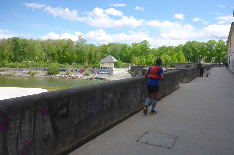 Ich fühle mich gut, der Track auf meiner Uhr weist mir den richtigen Weg, so kann ich etwas Fahrt aufnehmen und auch alleine laufen. Ein kleines Déjà-vu stellt sich ein, beim Isar-Arena Marathon vor genau 5 Wochen lief es auf dem identischen Abschnitt, am Nördlichen Englischen Garten entlang, ebenfalls ausgesprochen gut. Zu meiner Überraschung kann ich nach etwa 5 km wieder Udo vor mir ausmachen. Das motiviert mich noch etwas mehr und ich versuche mein Tempo zu halten. Immer geradeaus an der Isar entlang geht es Richtung Stadtmitte.