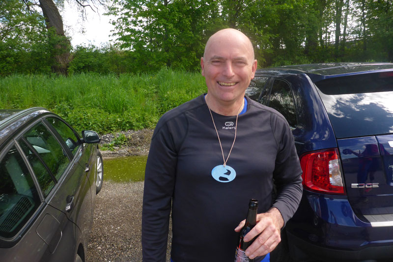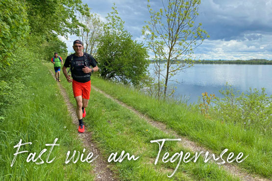 Nach 10 km erreichen wir Neufinsing, einen Kilometer lang ist der Ortsdurchlauf. Zurück geht’s diesmal direkt am Seeufer entlang, hier kann man erst die riesigen Ausmaße des Sees sehen, der fast so groß ist wie der Tegernsee. Und wir bekommen heute sogar einen prachtvollen Ausblick auf die Alpen …fast wie am Tegernsee. Charly und Thomas haben sich mittlerweile nach vorne abgesetzt. Nach 19 km sind wir wieder am Parkplatz zurück und legen erstmal eine kleine Pause zur Verstärkung ein.