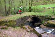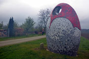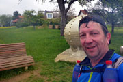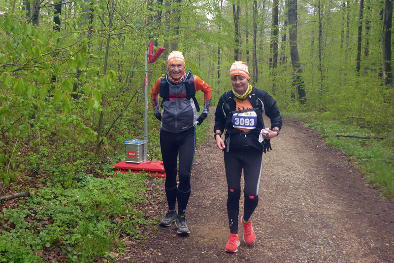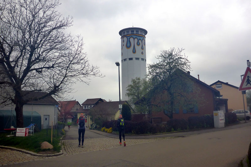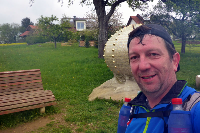 Bis Kilometer 21 müssen wir noch durchhalten. Axel hat eine Verpflegungsstelle für uns eingerichtet und auf die freue ich mich schon. Nicht nur das Getränk in der Bügelflasche, sondern auch eine kleine Pause sehne ich nun herbei. Im Vergleich zu den vergangenen Läufen bin ich nicht mehr ganz so frisch und es könnte nun gerne auch vorbei sein. Frisch gestärkt machen wir uns dann aber doch wieder auf die Socken. Es läuft zunächst noch ganz gut und wir passieren die „Perle der Erinnerung“. Ich halte das neue Kunstwerk aus der Entfernung erst mal für eine Schnecke und hoffe insgeheim, dass es mir zu Ehren dort errichtet wurde. Weder ist es eine Schnecke, noch hat es irgendetwas mit meinen vergangenen Teilnahmen hier zu tun. Leicht geht es nun bergab. Andreas und Judith schicke ich weiter. Ich komme alleine zu recht und Andreas ist beruhigt, nachdem ich ihm zugesichert habe, dass ich ein Handy im Laufrucksack habe. Bis nach Reichenbach muss Axel immer wieder auf mich warten und ich mach mir Sorgen, dass er sich eine Erkältung holt. Es ist ein zäher Kampf, aber ich kann ihn überzeugen, dass ich das schon hinbekomme. Axel erklärt mir noch kurz den neuen Weg bei Reichenbach, denn die Ortschaft selbst durchlaufen wir heute nicht.