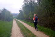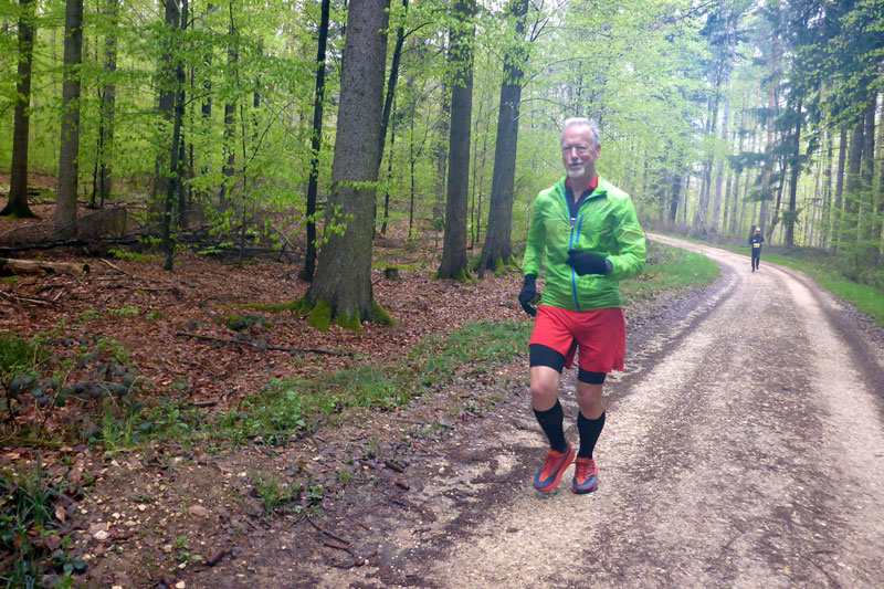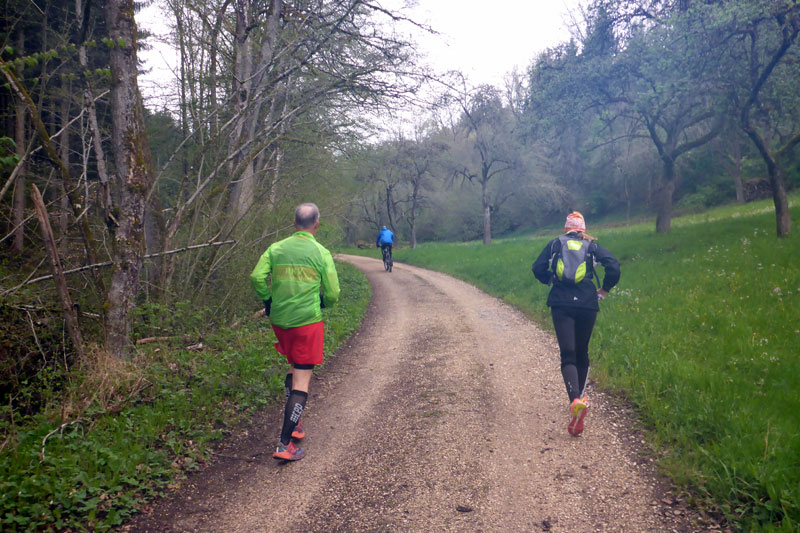 Kurz nach dem Ortsschild geht es rechts weg und ein langer Anstieg liegt vor mir. Auf halben Weg treffe ich auf ein Pärchen, das mit dem Hund unterwegs ist. Ich komme mit ihr kurz bezüglich des Marathons ins Gespräch und beantworte gerne ein paar Fragen. Als ich weiterlaufen will, erzählt sie mir noch, dass in ihrem Lokalblatt stand, dass schon in der Vorwoche zwei Bayern dabei gewesen sind. Der dritte durfte nicht, da er unter Quarantäne stand, da seine Frau positiv war. „Das ist meine Frau“, erklärte ich kurz verwundert. Was in den baden-württembergischen Blättern so alles steht. Ich laufe weiter. Ein Baumstamm lädt zur Pause ein. Ich habe selbst eine Flasche mit Bügelverschluss und eine Breze. Am Ende des neuen Streckenteils habe ich nicht einmal mehr zehn Kilometer vor mir. Einzelne Weiler und Pferdehöfe durchlaufe ich auf dem Rückweg nach Lichtenwald. Es wird richtig zäh, was aber nicht an der Attraktivität der Strecke, sondern an meiner Fitness liegt. Offensichtlich haben die letzten Wochen ein paar Körner gekostet.
