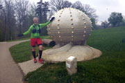 Nach wenigen Minuten erreichen wir auch schon das Rathaus, wo unter normalen Bedingungen gestartet wird. Ein paar „Fans“ jubeln uns zu und wünschen uns viel Glück. Vorbei am Kunstwerk „Augenblick“ - für mich einfach das Ei - lassen wir es gemütlich laufen. Es ist noch eben. Dieser Luxus wird bald vorbei sein. Aber es fühlt sich gut an und das stimmt mich zuversichtlich. Der lange Downhill, der nun vor uns liegt, hat mir immer schon gefallen und wir erreichen eine ansehnliche Schrittlänge. Unten angekommen geht es durch eine Schleife und dann liegt natürlich ein langer zäher Anstieg vor uns. Bis Kilometer 16 geht es von nun an nahezu nur bergauf. Irgendwann merke ich auch, dass die Oberschenkel schwer werden. Das ständige Bergauflaufen kostet Kraft. Für Axel ist es heute gefühlt nur ein Spaziergang. Immer wieder wartet er auf mich. Doch wir kommen voran und irgendwann ist das Ende des Anstiegs erreicht.