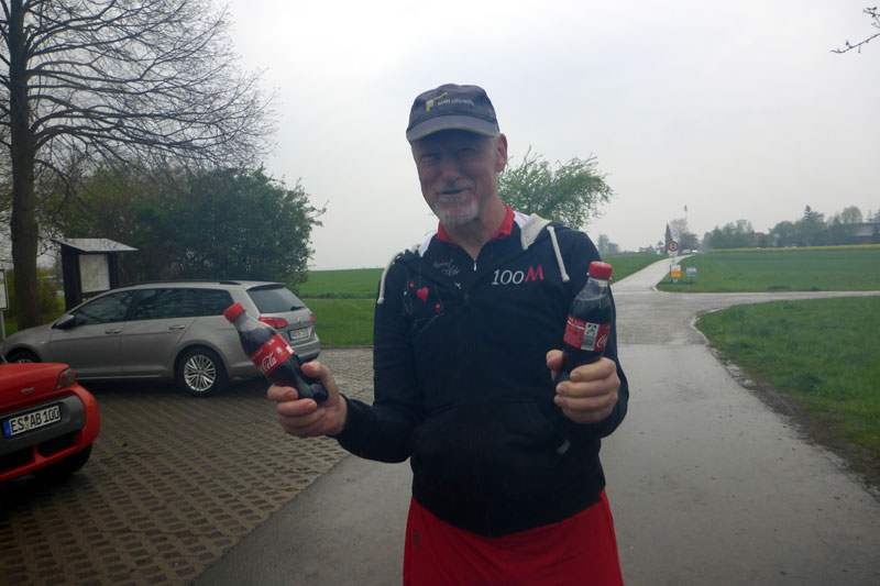 Kurz vor Lichtenwald wartet Axel mit einer kühlen Cola auf mich. Ich kann mich noch ein bisschen stärken. Im Ziel werde ich dann von Andreas, Judith und Axel erwartet. Es ist inzwischen ganz schön kalt geworden. Es regnet, aber der Kühlschrank mit den Getränken ist überdacht. Was für ein Service. Wir tauschen uns noch kurz aus, aber schon bald zieht es jeden nach Hause. Ich ziehe mich notdürftig um, mach die Sitzheizung an und stelle die Heizung von zwanzig auf dreiundzwanzig Grad. Mich friert, aber ich bin glücklich den Lauf gefinisht zu haben. Ob ich tatsächlich Born To Run bin, überleg ich im Auto so vor mich hin, während mich Bruce live unterhält. Vermutlich eher nicht, aber a zacher Hund. Das trifft‘s vermutlich eher.