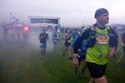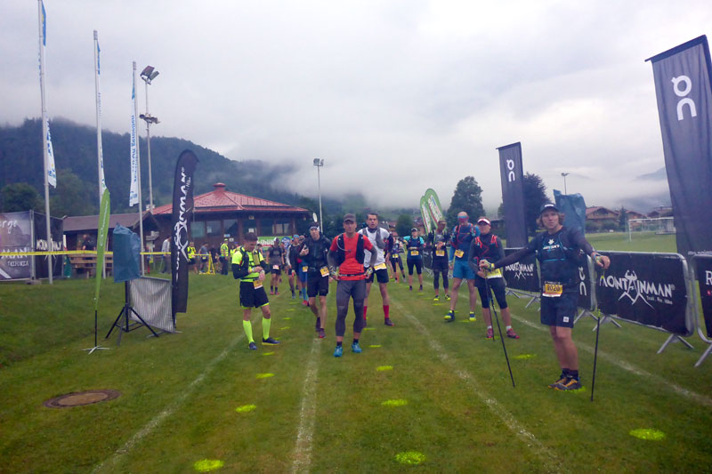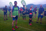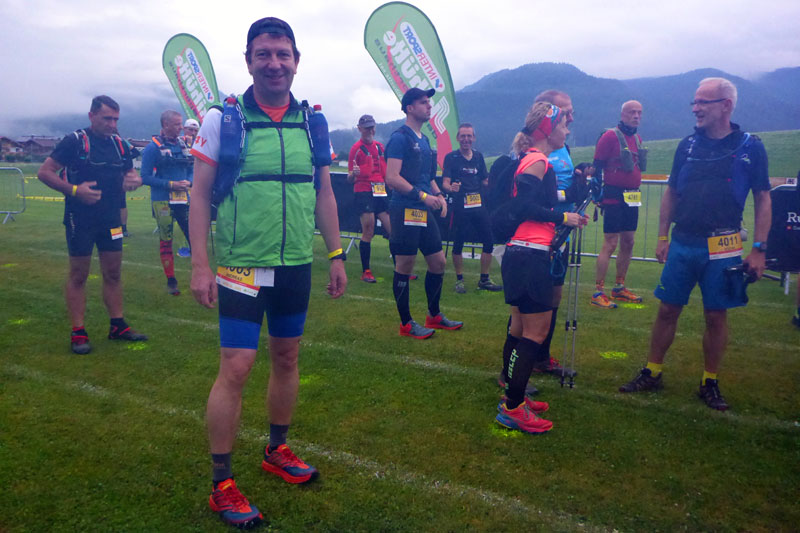Nach dem obligatorischen Abend beim Italiener, heißt es frühzeitig Gute Nacht zu sagen. Der Start ist wie gesagt um 6.00 Uhr und daher wird mich der Wecker um 4.30 Uhr aus dem Schlaf reißen. Mit der Hoffnung auf besseres Wetter, als hervorgesagt finde ich schnell die notwendige Ruhe. Um 3.00 Uhr werde ich wach. Draußen schüttet es wie aus Eimern. Ich kann weiterschlafen und als ich schließlich aus meinem Bett krieche, geht der erste Blick nach draußen. Es hat aufgehört zu regnen, aber die Wolken hängen dicht über den Bergen. Normalerweise kann ich von meinem Balkon bis zum Wilden und Zahmen Kaiser blicken, heute sehe ich vielleicht noch zwei Häuser weiter. Es ist eine ziemliche Suppe da draußen. Nichtsdestotrotz mache ich mich eine dreiviertel Stunde vor dem Start auf den Weg zum Festsaal. Es dämmert gerade und beim Start sollten keine Stirnlampen, die ebenfalls zur Pflichtausrüstung gehören, nötig sein. Ich komme noch mit einigen Teilnehmern ins Gespräch bis meine beiden Lauffreunde aus Baden-Württemberg und auch Andreas Bettingen eintreffen.