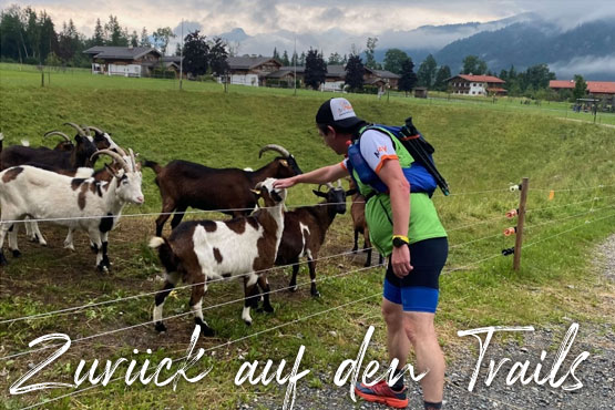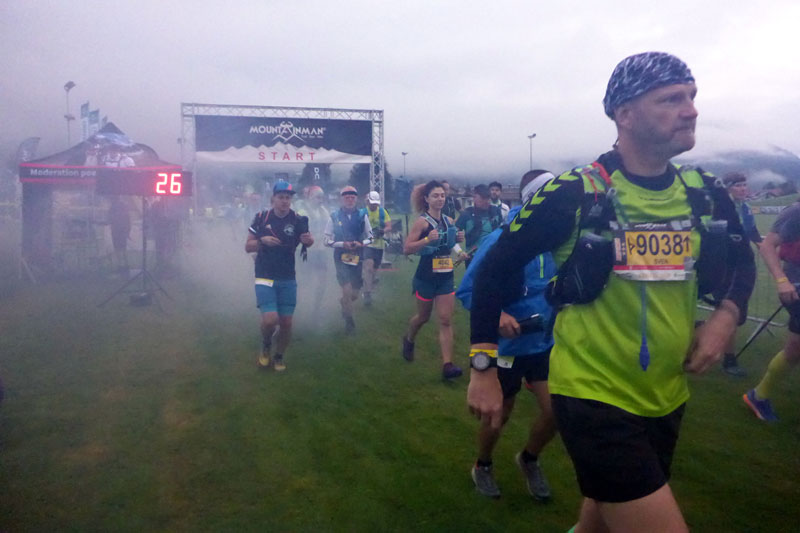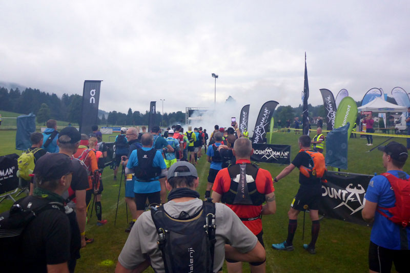 Bald ist es so weit, dass wir starten können. Rudi und Stephan erklären noch einmal die pandemiebedingten Regeln. Es sind keine Masken im Start- bzw. Zielbereich notwendig. Auch an den Verpflegungsstationen dürfen wir darauf verzichten. Vor der Startlinie sind auf dem Rasen zahlreiche gelbe Punkte aufgesprüht. Laut Rudi ist es ganz einfach wie beim „Mensch-ärgere-Dich-nicht“. Jedes Manschgerl stellt sich auf einen Punkt, womit auch die Mindestabstände gesichert sind. Die Siegambitionierten bittet man nach vorne und alles klappt ganz wunderbar. Ich freue mich wie ein kleines Kind, endlich wieder in einem richtigen Starterfeld zu stehen und kann es kaum erwarten loszulaufen. Die Läufer werden noch zum Klatschen animiert, einige sind aber noch zu müde, dennoch ist die Stimmung gut. Die Musik verstummt und eine riesige Kuhglocke gibt das Startsignal. Durch eine künstlich erzeugte Rauchwolke hindurch machen wir uns auf den Weg. Der MOUNTAINMAN – Reit im Winkl ist gestartet.