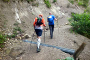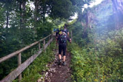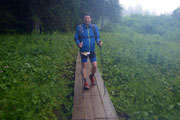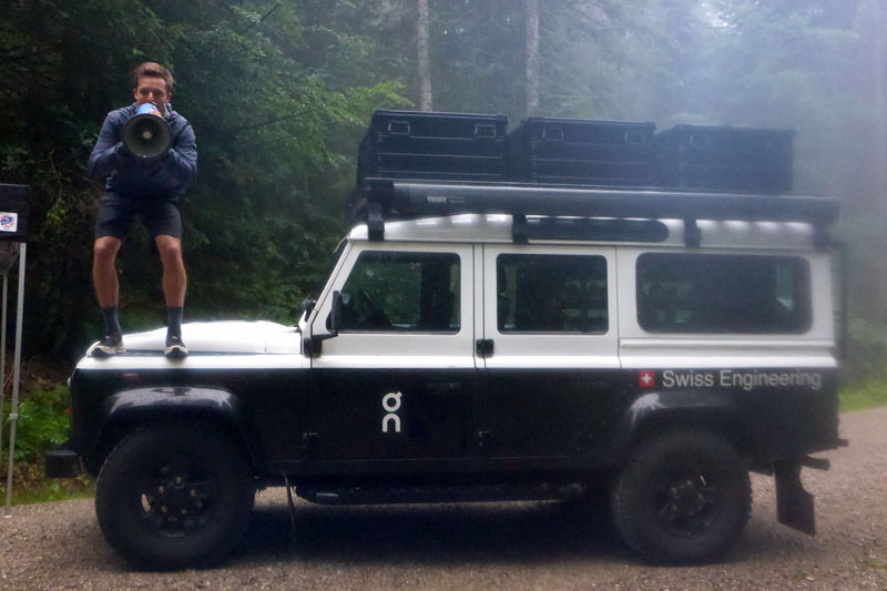 Lautstarke Motivationsrufe dringen durch den Wald und mir ist klar, dass der erste Anstieg so gut wie bewältigt ist. Als ich den Jeep der „On“-Mitarbeiter erreiche, die sich lautstark mit ihrem Megafon bemerkbar machen, kann ich erst mal durchatmen. Ab jetzt geht es eine Zeit lang nur noch bergab. Ich befinde mich in Begleitung von Axel, mit dem ich den Lauf gemeinsam bewältigen will. Auch Andreas Bettingen ist noch gleichauf, wird mir aber bergab enteilen. Nun teilt sich auch die Strecke. XL und L geht nach links weg. Die M-Strecke führt nach rechts. Die Ausschilderung ist übrigens vorbildlich. Gut sichtbare Schilder in der jeweiligen Farbe leiten uns durch die Berge. Auch Markierung am Boden sind vorhanden, so dass ein Verlaufen unmöglich ist.