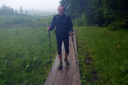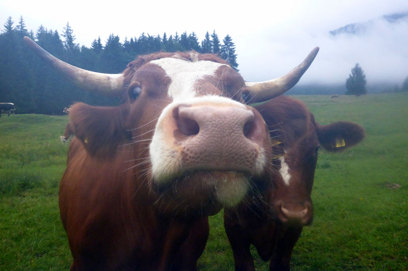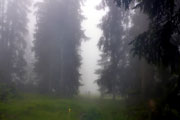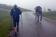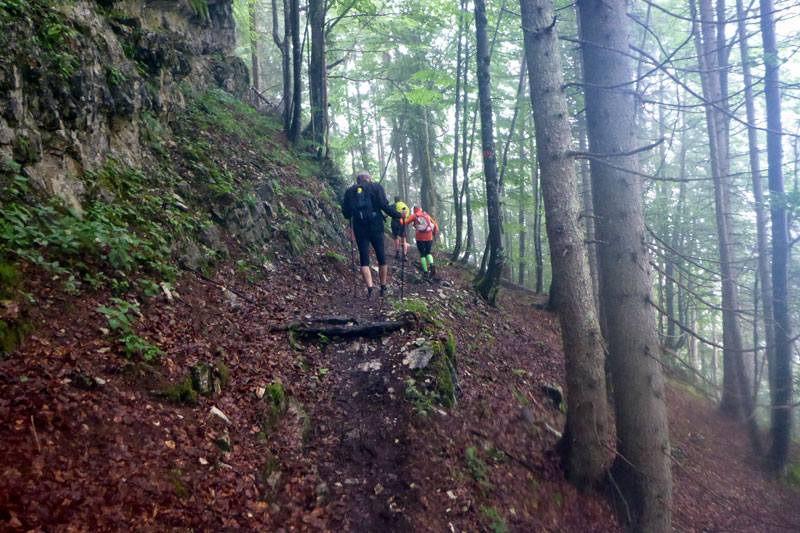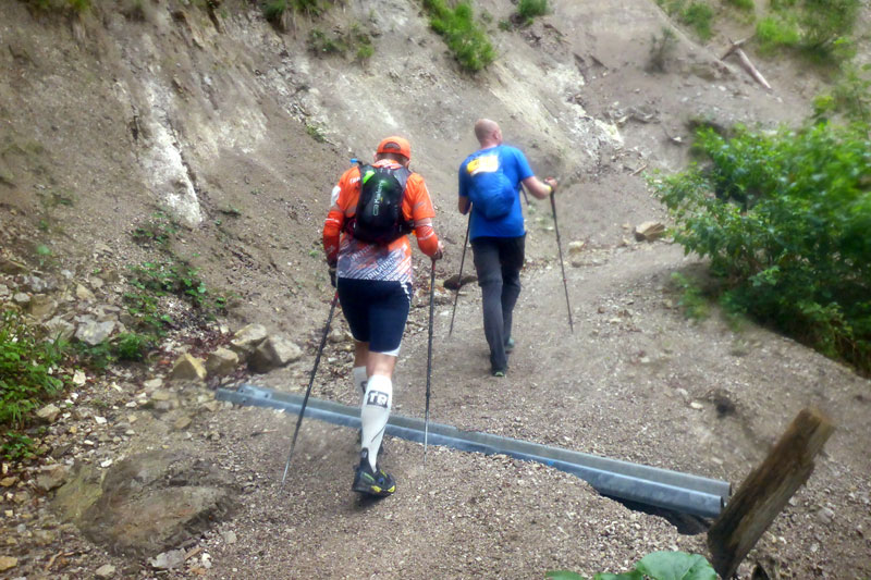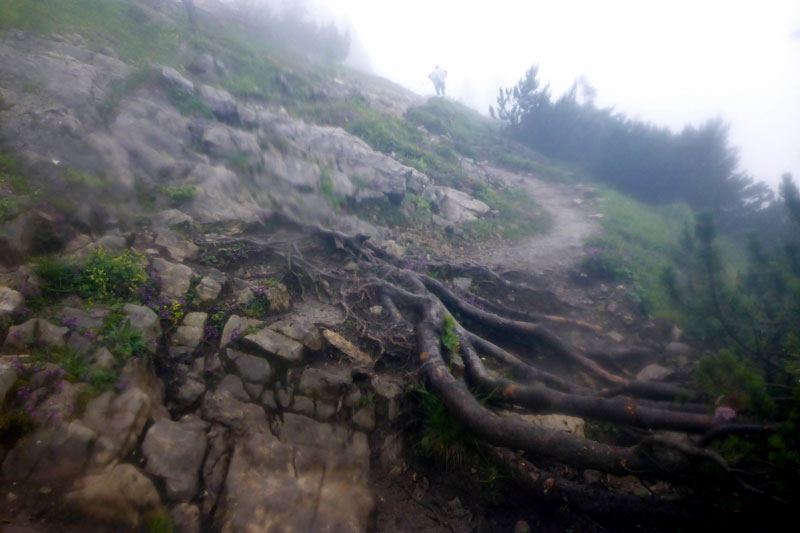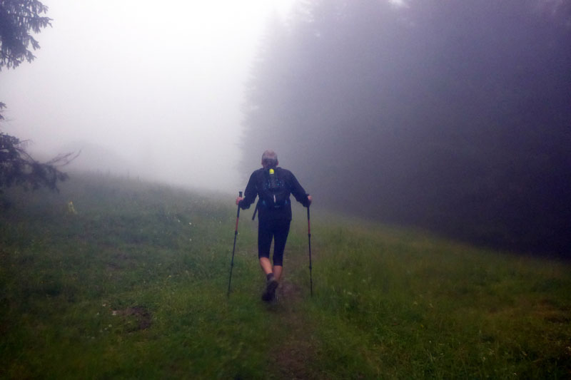 Der nächste längere Anstieg liegt nun vor uns. Das Panorama Wirtshaus Dürrnbachhorn ist unser nächstes Ziel. Zunächst führt uns noch ein breiter Weg nach oben, der gut zu belaufen ist. Je weiter uns der Weg nach oben führt, umso mehr nimmt der Nebel und auch der Regen zu. Die Sicht verschlechtert sich immer mehr. Vor einer Alm führt der Weg auf einem schmalen Pfad weiter nach oben. Wir haben uns inzwischen zu einer fünfköpfigen Truppe vereint. Ein Läufer vor mir hat mit den Anstiegen sichtbar Probleme. Immer wieder rutscht er auf der schlammigen Strecke aus. Meine Trailer haben einen etwas besseren Grip, trotzdem muss auch ich ab und zu meine Stöcke zur Hilfe nehmen, um auf den Füßen zu bleiben.