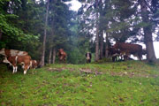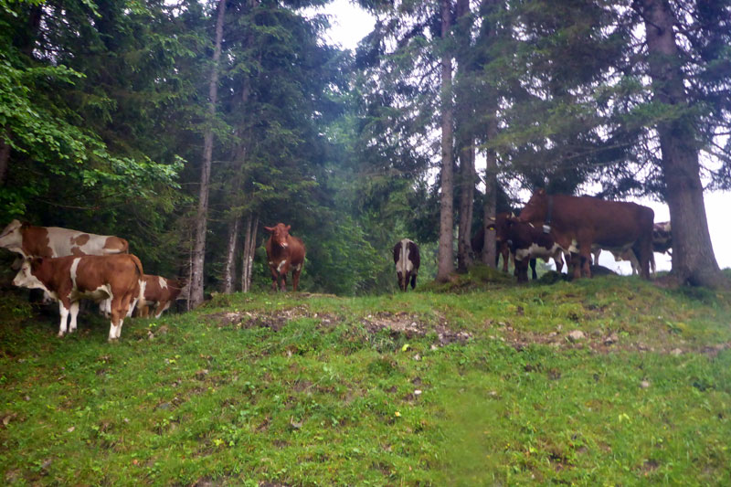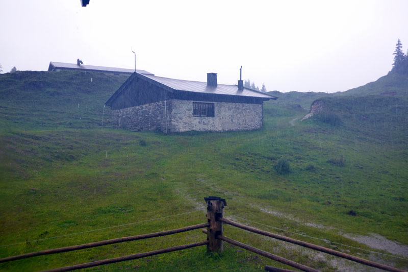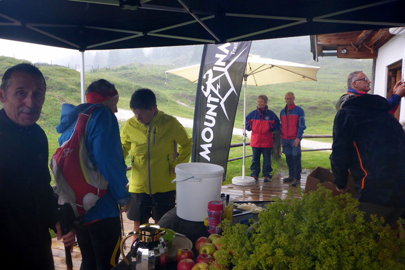 Am Ende des Bergabstücks, bei dem wir nahezu alle gewonnenen Höhenmeter wieder verloren haben, geht es über einen feinen Single-Trail, den ich von einer Wanderung mit Silke noch kenne. Das heißt auch, dass die Nattersberg Alm und somit die zweite Verpflegungsstation bei Kilometer 11 vor uns liegt. Ein wahres Büffet erwartet uns. Kuchen, Obst, Griebenschmalzbrote: Da greife ich doch gerne zu. Neben Wasser und Iso gibt es auch Bier und Obstler. Es ist noch nicht mal 8 Uhr am Morgen, ich kann mich zurückhalten. Aber einige vor uns haben sich auch hier schon bedient, versichert mir der Wirt. Während unserer kurzen Rast beginnt es nun erstmals richtig zu regnen und wir bleiben ein paar Minuten länger als geplant unter dem Sonnenschirm, bevor wir uns zu weiterlaufen motivieren können. Die lange Regenjacke bleibt aber vorerst mal im Rucksack, die kurze muss reichen. Wir haben ja noch einige Kilometer vor uns.