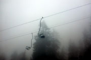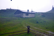 Die Sicht hat sich inzwischen derart verschlechtert, dass ich Axel zwanzig Meter vor mir oft nicht mehr erkennen kann. Die letzten beiden Kilometer bis hoch zum Panorama Wirtshaus kosten uns noch einmal ordentlich Kraft. Teilweise versinke ich bis zu den Knöcheln im Matsch und von oben kommt immer mehr Regen. Trotz der Umstände kommen wir gut gelaunt am nächsten Verpflegungspunkt bei Kilometer 18 an. Wir können uns im Wirtshaus etwas aufwärmen. Das Büffet ist wieder hervorragend. Mir hat es der Käsekuchen angetan. Wir befinden uns auf 1610 Höhenmetern und hätten von der Terrasse aus, einen großartigen Blick über die Alpen. Heute ist jedoch nichts als eine graue Nebelwand zu sehen. Ich nütze die Pause und ziehe mich um. Ein trockenes Laufshirt und die lange Regenjacke kommen nun zum Einsatz.