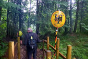Wir verlassen zügig die Sportanlage und die ersten Kilometer werde ich erst einmal zum Warmlaufen nützen. Es gibt keine nennenswerten Steigungen. Über den Krautloidersteg tauchen wir in den Märchenwald ein. Geschnitzte Hexen und sonstige Sagen- bzw. Märchenfiguren säumen den Weg. Nachdem der Start noch trocken war, beginnt es nun leicht zu nieseln. Aber das kann ich mehr hören als spüren. Der Wald schützt uns noch davor frühzeitig nass zu werden. Bei Kilometer 3 erreichen wir Gut Steinbach und damit die erste Verpflegungsstelle. Entweder habe ich sie übersehen oder sie gab es heute gar nicht. Egal, ich habe gut gefrühstückt und brauche noch keine Verpflegung, auch wenn ich weiß, dass nun der erste Anstieg vor uns liegt.