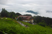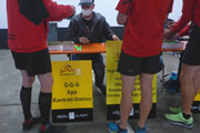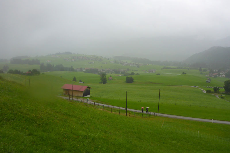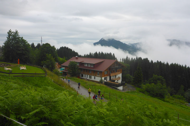 In Hüttenberg erwartet uns nach 3 km die erste Getränkestation, im Anschluss wird es spürbar steiler. So gewinnen wir schnell an Höhe, was uns aber an Aussicht relativ wenig einbringt. Ganz anders als sonst ist nämlich heute das Wetter. Normalerweise haben ja die Veranstalter Axel Reusch und Christian Feger am APM-Wochenende immer Hochsommer gebucht. Bei allen meinen Starts herrschte jeweils Prügelhitze mit oft über 30 Grad am Nachmittig, drückender Schwüle und dazu eine wunderbare Weitsicht über die sattgrüne Allgäuer Voralpenlandschaft, was uns heute aber weitestgehend versagt bleibt. Verschämt verhüllt sich sogar der Grünten, betitelt als der Wächter des Allgäus, überwiegend in Wolken. Zum Laufen sind die Temperaturen mit 13 Grad aber optimal. Zumal es zwar dicht bewölkt ist, aber von Regen sollen wir vorerst einmal verschont bleiben, meinen die Wetterfritzen. Höchstens am Nachmittag kann mal ein Schauer runterkommen.