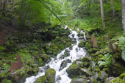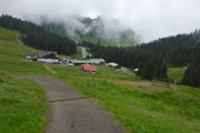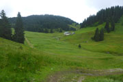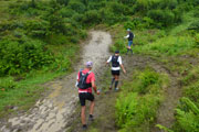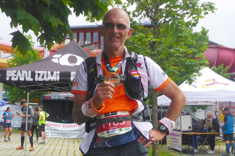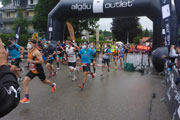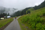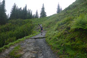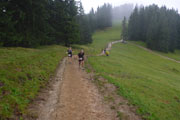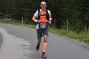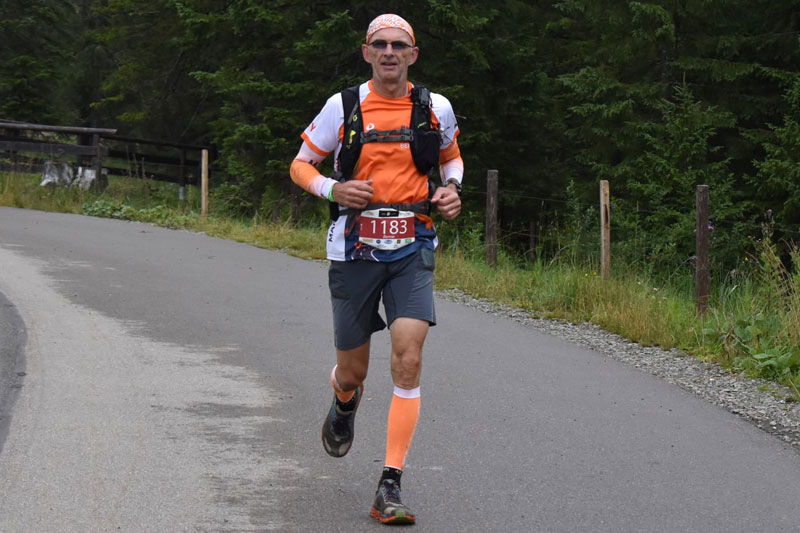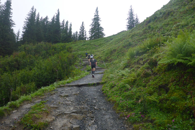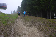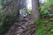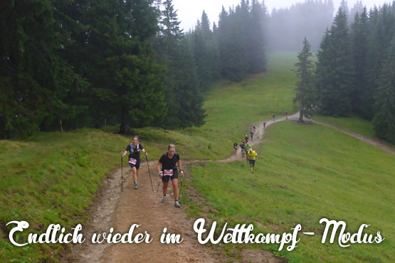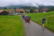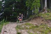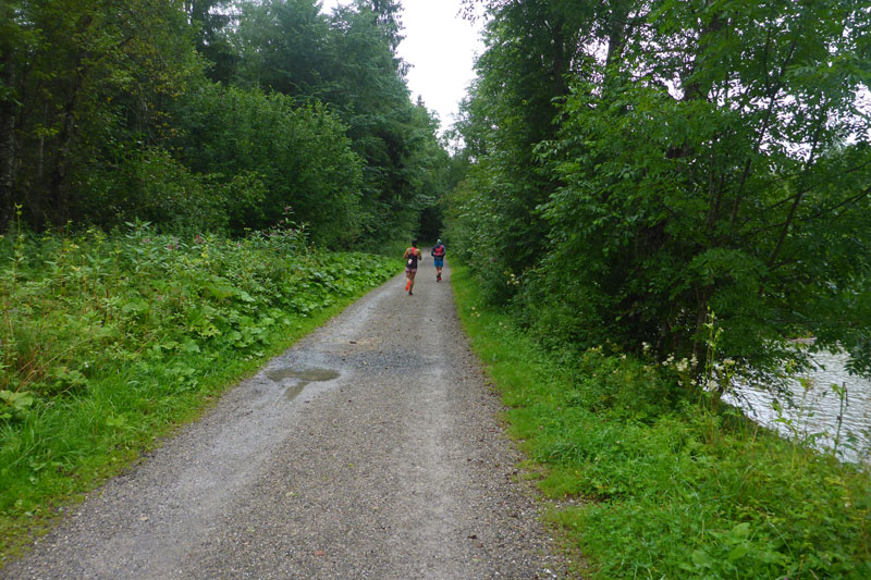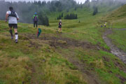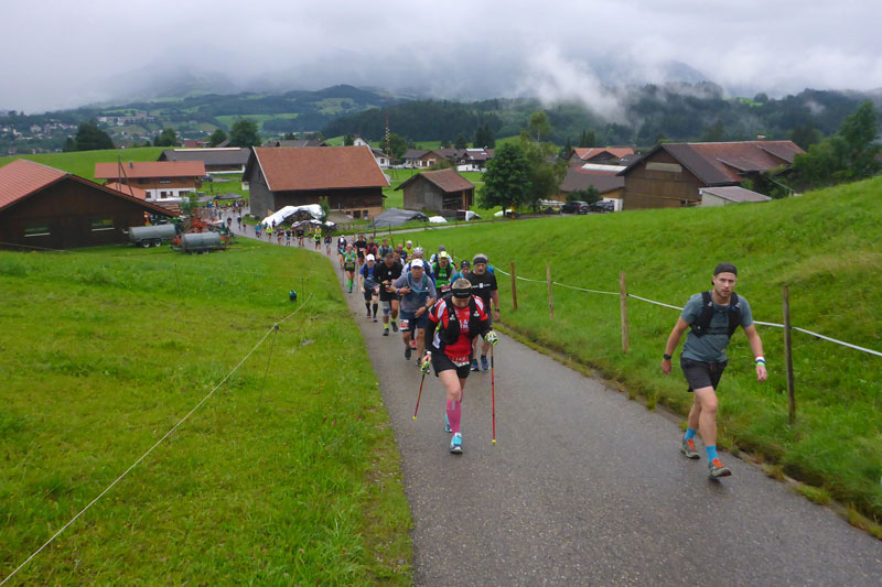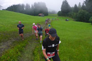 Optisch besonders schön finde ich immer den weglosen Abschnitt mitten durch eine Wiese (km 4,5), wie auf einer Perlenschnur aufgezogen reihen sich Läufer an Läufer. Frisch gemäht ist sie, aber auch vollgesaugt mit Wasser. Heute sind hier wasserresistente Schuhe von großem Vorteil oder wie in meinem Fall, die Schlappen mit den dicken Sohlen. Nach der Wiesenquerung folgt ein ausgetrampelter Pfad durch den Wald, die vielen Vorläufer haben ihn matschig und extrem rutschig werden lassen. Ich muss mehrmals Bodenkontakt aufnehmen und so geht es einigen anderen auch. Viele haben heutzutage Stöcke dabei, das ist hier von großem Vorteil, dabei kann ich mich erinnern, dass sie in den ersten Jahren beim Marathon gar nicht erlaubt waren. Wie das halt bei klassischen Bergmarathons oftmals so gehandhabt wird. Aber auch hier hat man sich vermutlich dem Trend Trailrunning angepasst. Was ja nicht unbedingt schlecht ist, wie das heute beweist. Bei trockenem Sommerwetter ist die Marathonstrecke auch problemlos in Straßenschuhen zu bewältigen.