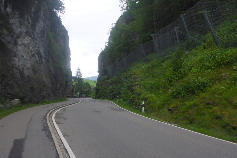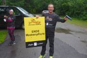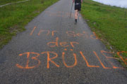 Einen großen Fan haben wohl Julia & Markus, mit Kreidespray ist die Teerstraße vollgepflastert mit Sprüchen und Anfeuerungen für die beiden. Kurz darauf erreichen wir die Bergstation der Ofterschwanger Weltcup-Express-Bahn auf 1300 Meter Höhe. Skifahrer können hier im Winter auf der Weltcup-Piste runterwedeln. Seit 1999 wurden 17 Rennen im Slalom und Riesenslalom durchgeführt, zuletzt 2018. Für uns ist eine Getränkestation aufgebaut. Knapp 8 km liegen hinter uns.