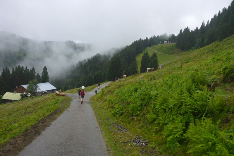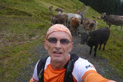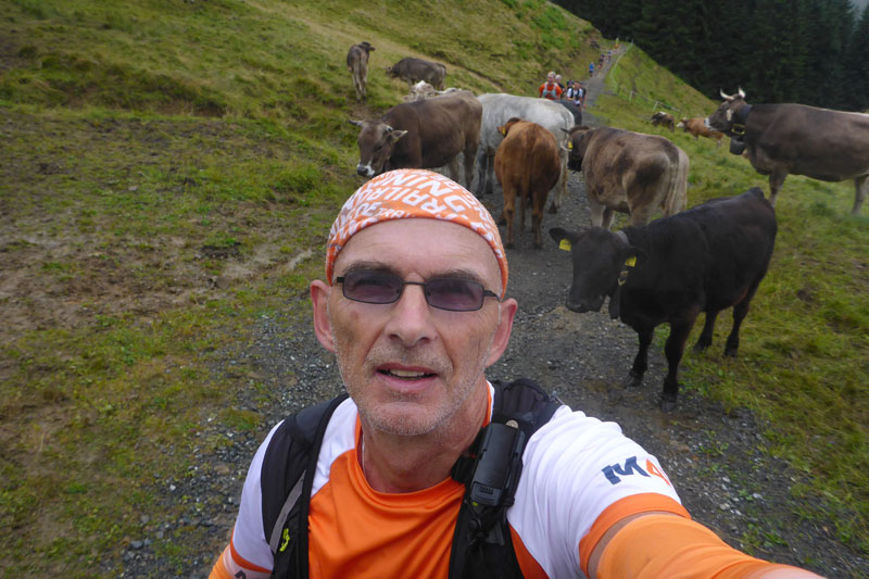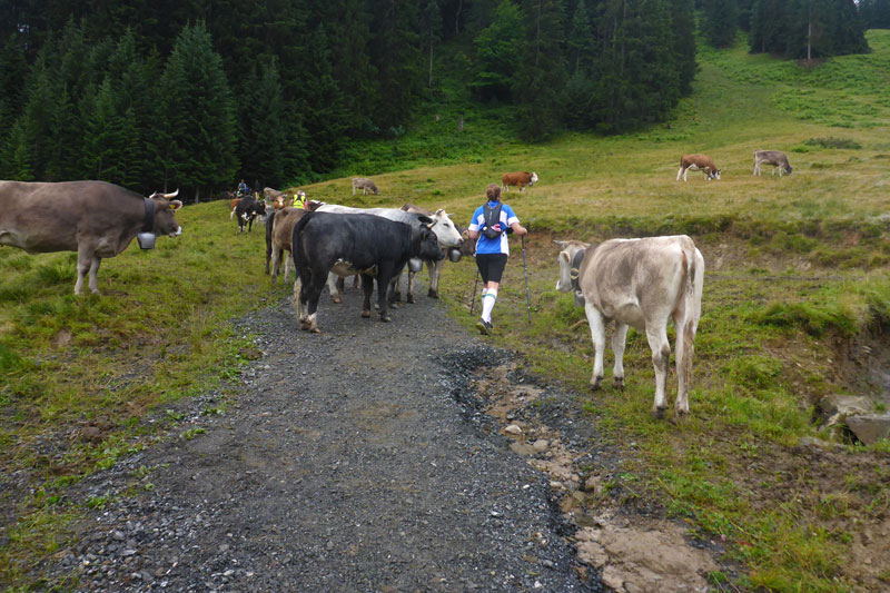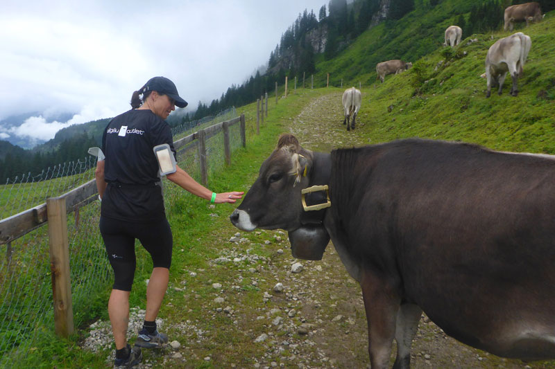 Auf der digitalen Anzeigentafel der Ossi-Reichert-Bahn werden 10,3 Grad angezeigt. Ich hab meine Ärmel hochgezogen, es zieht spürbar. Ein flacherer Abschnitt führt uns durch eine Alpe. Die berühmten Allgäuer Kühe dürfen natürlich nicht fehlen. Alle sind ganz friedlich und lassen uns anstandslos durch ihr Revier ziehen. Sieht manchmal fast so aus, als würden sie für uns Spalier stehen. Vermutlich sind sie aber an Wanderer und heute eben an eine Horde verrückte Runner gewöhnt.
