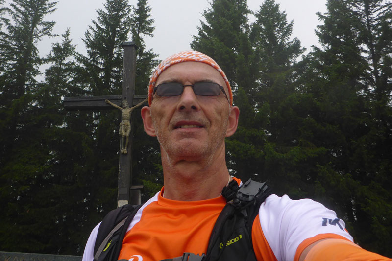 Der finale Aufstieg zum höchsten Punkt der Strecke auf den Weiherkopf hat es nochmal deftig in sich. Bis zu 25 % Steigung und Modder vom Feinsten. Ein Abdriften von der Ideallinie ist von Vorteil, ganz rechts am Waldrand kann ich etwas griffigeren Untergrund vorfinden. Auf 1665 m Höhe steht das Gipfelkreuz (km 12,5), im Übrigen das einzige, das wir passieren, normalerweise ein Punkt, wo es sich lohnt eine kurze Verschnaufpause einzulegen und die wunderbare Aussicht zu genießen. Heute ist das für mich mit einem kurzen Selfie erledigt, mehr lohnt sich nicht.