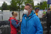 Der Startbereich liegt direkt vor dem Allgäu Outlet Center. Beim Marathon wird in zwei Wellen gestartet, 310 Teilnehmer*innen sind am Start. Als erstes dürfen diejenigen ran, die meinen, es unter 4:45 Stunden zu schaffen. Ich zähle mich nicht dazu und lasse erstmal den Schnelleren den Vortritt, so kann ich auch ein paar schöne Startfotos schießen. Ganz locker geht es zu im Startbereich, die Abstände sind problemlos einzuhalten. Ganz ungewöhnlich, ich treffe heute keinen einzigen Bekannten. Um Punkt 8.05 Uhr geht es dann endlich auch für mich wieder los mit einem echten Rennstart.