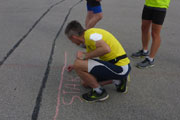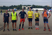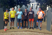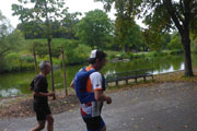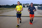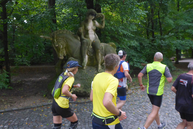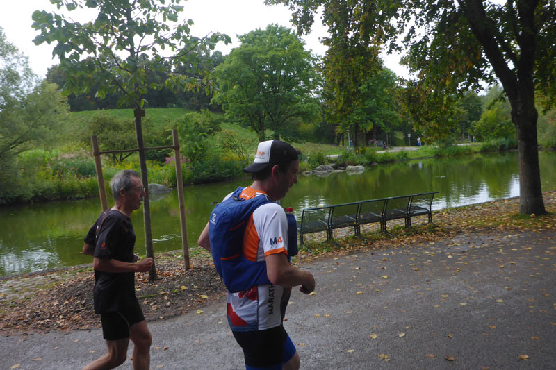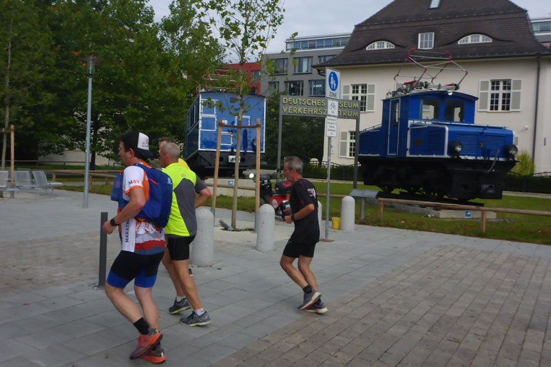 Die erste Runde laufen wir gemeinsam. Andreas hat die Strecke zwar mit Kreidepfeilen markiert, diese hat der Regen aber wieder weggewaschen. Apropos Regen. Bei unserem Start ist es trocken, aber etwas Regen im Laufe der vier Runden ist sehr wahrscheinlich. Vorbei am Verkehrszentrum des Deutschen Museums nähern wir uns dem Westpark. Ich habe die Runde ja schon letztes Jahr ausgiebig beschrieben und an ihr hat sich auch nichts geändert. Gemeinsam drehen wir unsere Runde. Judith und Andreas geben von Anfang zu verstehen, dass sie heute etwas langsamer unterwegs sein werden. Zwei Marathons in Riga und Bratislava innerhalb der letzten beiden Wochen haben Kräfte gekostet und so geht es heute etwas langsamer voran. Ich selbst habe nach der ersten Runde das Gefühl, dass es heute ganz gut laufen könnte und so drehe ich Runde Nummer Zwei mit Axel. Bernie und Andy ziehen leicht davon. Nach der zweiten Runde ist ein kleiner Verpflegungsstopp an den Autos eingeplant, den wir jedoch nicht unnötig ausdehnen.