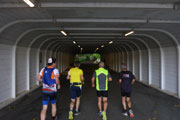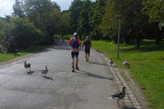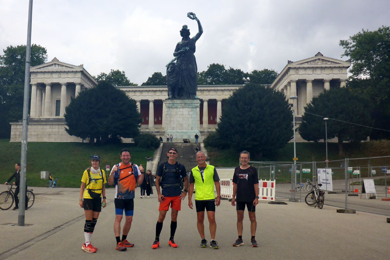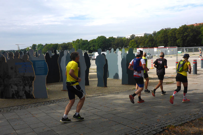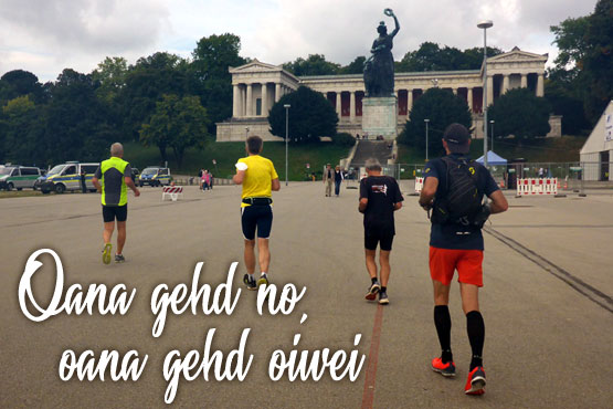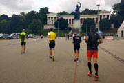 Um halb elf wird gestartet und wir machen uns rechtzeitig auf den Weg in Richtung Esperantoplatz. In dessen Nähe wird gestartet und erst einmal eine kleine Schleife in Richtung Bavaria gelaufen. Während Andreas ein paar Worte zur Strecke verliert, zeichnet er mit einer Kreide - unter Aufsicht des Unterstützungskommandos Dachau - die Startlinie auf den Teer. Für ein gemeinsames Gruppenfoto nutze ich meine Beziehungen und spanne einen der USK‘ler als Kameramann ein. Die Frage nach dem Startschuss verkneife ich mir, dennoch will das USK gerne das Startsignal übernehmen, was jedoch leicht daneben geht. Wir zählen gemeinsam von drei runter und laufen los. Nach den ersten paar Metern ertönt auch schon das Hupsignal der Polizei. Ich bedanke mich trotzdem und laufe in Richtung Bavaria. Unsere beiden Schwaben im Feld sind interessiert und so geben Bernie und ich unser Wissen über die Statue, sowie die Ruhmeshalle zum Besten. Nach einer kurzweiligen Runde um die Theresienwiese entschwinden wir durch eine Unterführung in Richtung Westpark.