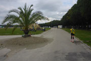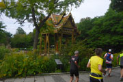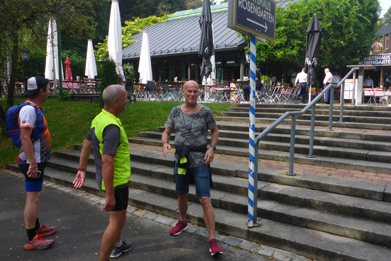 Die dritte Runde starten wir wieder als Quartett. Lediglich Judith und Andreas bleiben erwartungsgemäß etwas zurück. Im Westpark passieren wir mehrere Biergärten und so keimt bei uns die Idee eines Boxenstopps auf. Am Ende der dritten Runde soll es so weit sein. Diese Aussicht motiviert und wir kommen gut voran. Axel lässt sich etwas zurückfallen und so bilde ich gemeinsam mit Bernie und Andy das Führungstrio. Der Biergartenbesuch scheint uns aber nicht vergönnt, denn im westlichen Teil des Westparks beginnt es zunächst leicht, schließlich etwas fester zu regnen an. Wir sind bald klatschnass, was bei Temperaturen um die zwanzig Grad aber nicht unangenehm ist. Der Boxenstopp fällt dennoch ins Wasser.