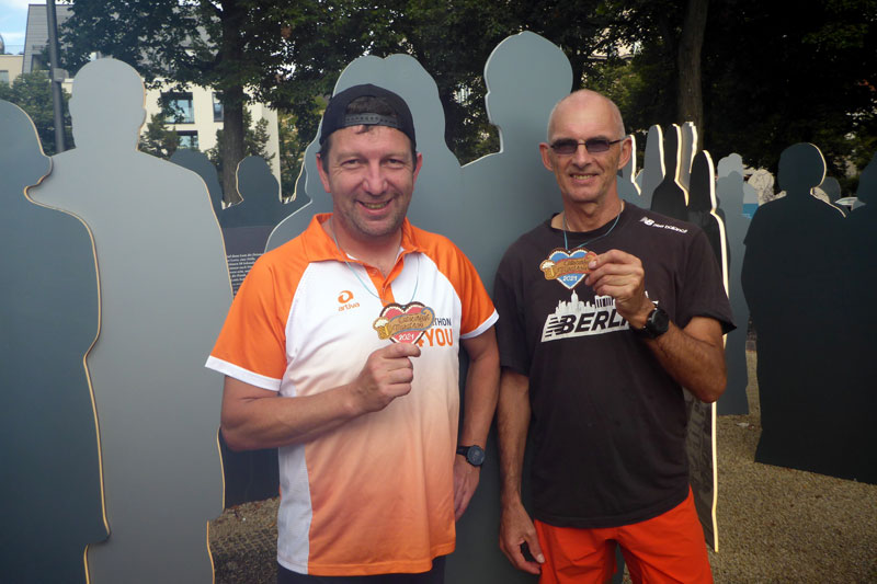 Als wir die Theresienwiese wieder erreichen, schließt der Himmel wieder seine Schleusen und wir bremsen noch einmal bei unseren Autos rein. Ein trockenes Lauf-Shirt gibt mir gleich ein besseres Gefühl und die finale Runde steht an. Ich fühle mich immer noch gut und habe lockere Beine. Da Bernie am nächsten Tag noch zwei Runden beim Friedberger Halbmarathon drehen will, ist mit einer Tempoverschärfung seinerseits nicht zu rechnen. Auch Andy hat kein Interesse an der Temposchraube zu drehen und so laufen wir ziemlich entspannt die letzte Runde. Gemeinsam bringen wir sie auch zu Ende und freuen uns auf Bernies Kunstwerke. Ich entscheide mich in diesem Jahr für eine rosafarbene Medaille. Die blaue habe ich schon im Vorjahr mit nach Hause gebracht.