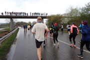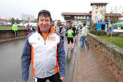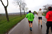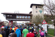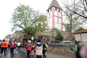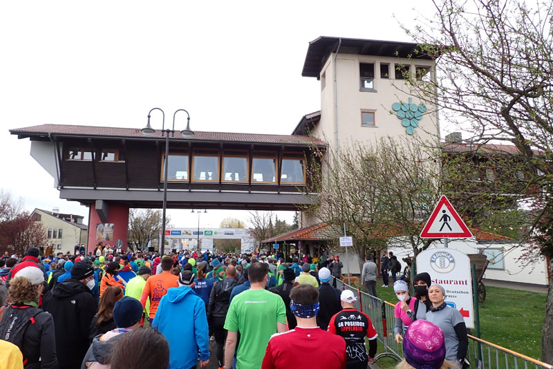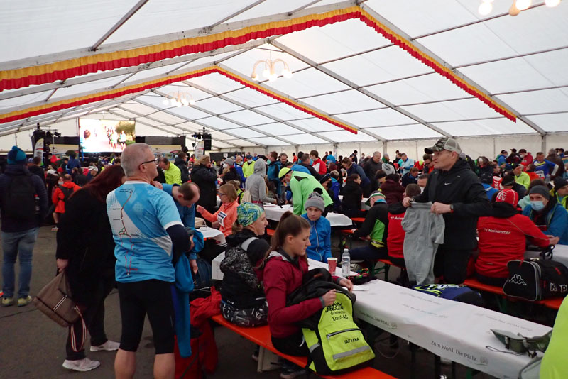Am nächsten Morgen trafen wir gut eine Stunde vor dem Start wieder in Bockenheim ein. Es regnete leicht und es war kalt, weshalb wir uns erst mal in das gut gefüllte Festzelt verzogen. Ich machte mich auf die Suche nach Wolfgang vom marathon4you-Team, der für heute den Bericht übernehmen würde. Leider blieb die Suche ergebnislos, es waren einfach zu viele Läufer da. Gut eine viertel Stunde vor dem Start machten wir uns wieder auf den Weg nach draußen und es hatte aufgehört zu regnen. Etwas kribbelig fühlte ich mich nun doch. Ein halbes Jahr nach dem letzten Marathon stand ich wieder in einer Startaufstellung und dann noch mit so vielen Menschen, das war ich nicht mehr gewohnt.