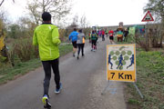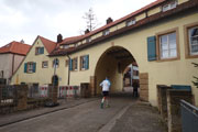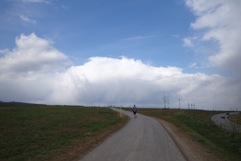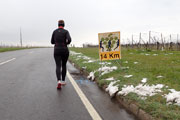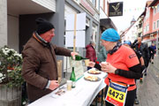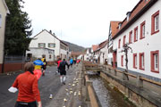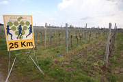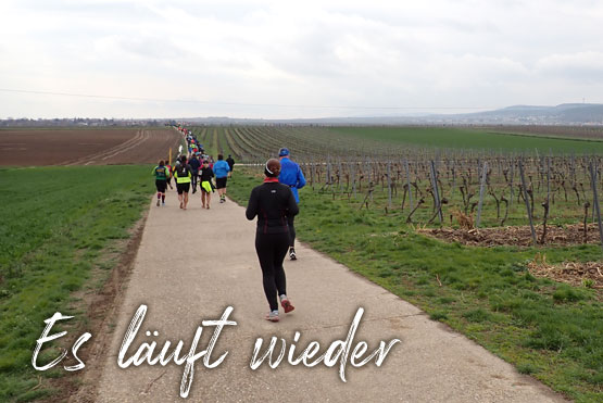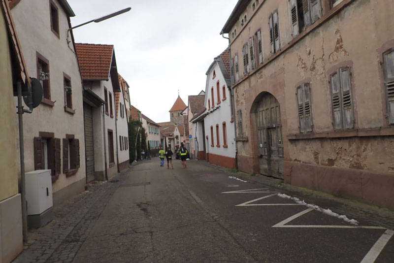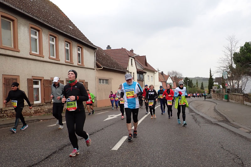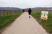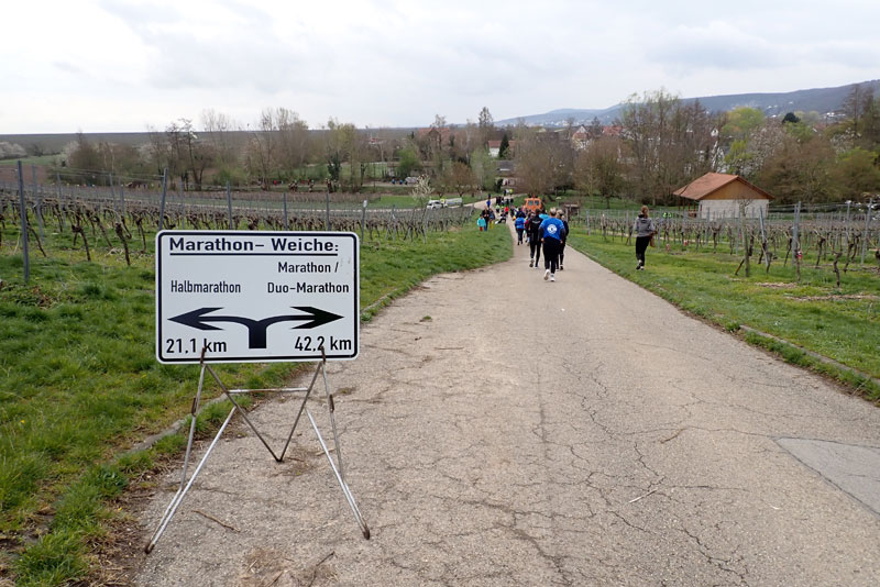 Über eine breite Staatsstraße ging es nach Asselheim, das wir nach drei Kilometern erreichten. Das Feld hatte sich bis dahin schon gut auseinandergezogen und ich konnte frei Laufen. In Asselheim wurden wir wieder durch eine große Anzahl von Zuschauern empfangen. Das tat wirklich gut. Am Ende der Ortschaft gab es noch einen kleinen Anstieg zu bewältigen, der mich zum ersten Mal marschieren ließ. Unser nächstes Ziel hieß Grünstadt, das wir etwa bei Kilometer 5,5 erreichen sollten. In der Fußgängerzone, die ich schon von einem Spaziergang mit Silke kannte, gab es dann auch die erste Verpflegungsstation. Zur Feier des gelungenen Einstands, denn ich fühlte mich wirklich gut, gab es erst mal ein Gläschen bzw. einen Becher Riesling. Aus Grünstadt raus ging es nun auf schmalen Landstraßen durch die Weinberge. Man hatte eine tolle Aussicht und kurz vor Kilometer 6 konnte ich auch schon dem Führenden des Halbmarathons applaudieren, der uns schon wieder entgegenkam.