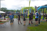 Eine Stunde später sieht der Himmel doch schon deutlich freundlicher aus, wobei noch viele Wolken in den Gipfeln hängen. Das Gewitter ist aber vollkommen durchgezogen, hat aber einiges an Wasser hinterlassen. Dafür haben wir angenehme Temperaturen von 14 Grad. Ein Hitzerennen wird es wohl nicht mehr geben. Zwanzig Minuten vor dem Start gibt es nochmal ein Kurzbriefing von Chefin Jutta, für diejenigen die noch gar nicht auf dem Laufenden sind. Anschließend checken die Mountainman-Kult-Speaker Rudi und Stephan schon mal die Nebelmaschine. Start ohne Nebel geht gar nicht. Alles ok, sie bläst super. Schon läutet der zweite Bürgermeister von Nesselwang die Starts von XL, L & M mit der Mountainman-Kuhglocke ein und los geht’s mit einer Ehrenrunde durch das Trendsportzentrum.