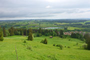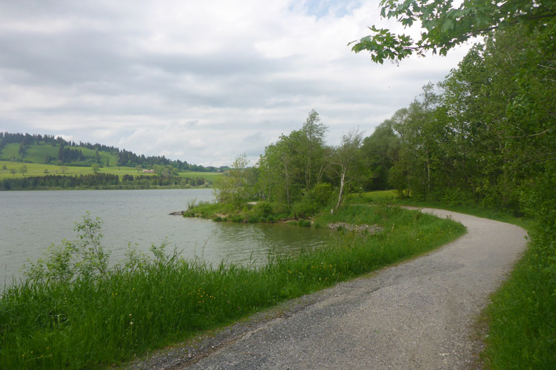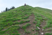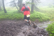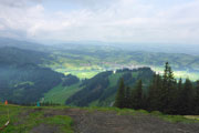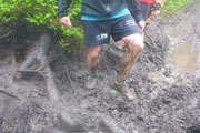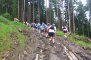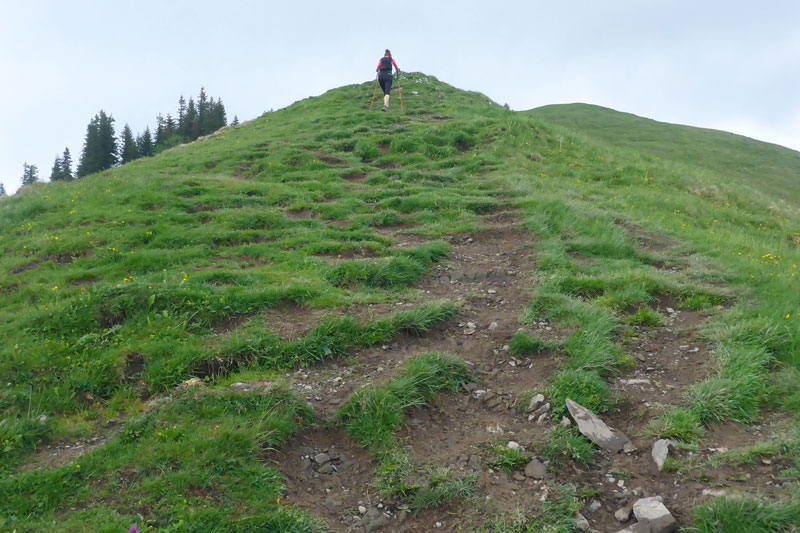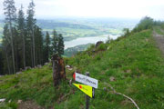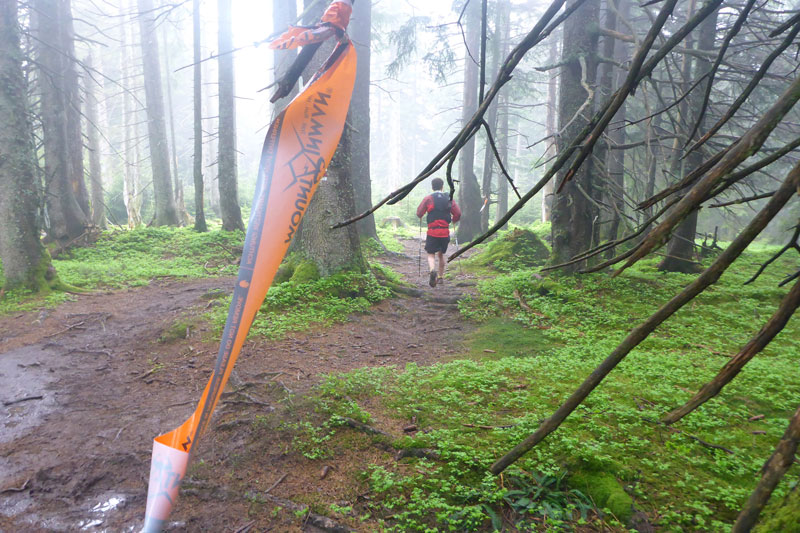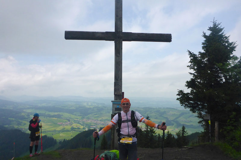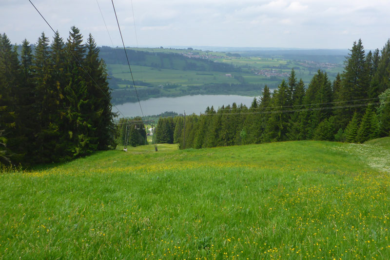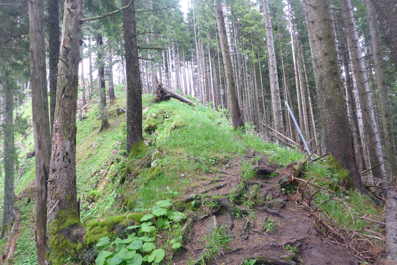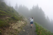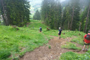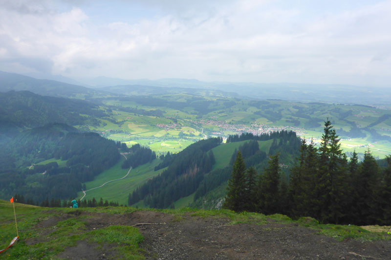 Ein Eyecatcher soll hier der Blick auf Schloss Neuschwanstein sein, den gibt es auf der Strecke nur zwei Mal. Wir haben gerade nicht optimale Sicht, aber wenn man ungefähr weiß, wo es liegt, kann man es mit viel Fantasie ausmachen. Nach meiner Frühstückspause packe ich meine Stöcke vom Rucksack. Ich kenn ja den Abstieg bereits, er ist immer sehr rutschig und eine diffizile Angelegenheit, nach dem nächtlichen Gewitter erwarte ich wieder einen anspruchsvollen Downhill. Ich hab mich nicht getäuscht, eine Mitläuferin muss bereits am Anfang Bodenkontakt aufnehmen.