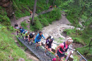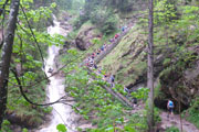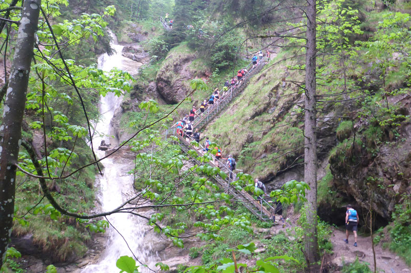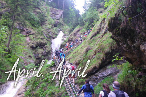 Der Einstieg führt uns gleich auf die längste und beeindruckende Stahlgittertreppe neben dem höchsten Wasserfall des Schloßbächel. Er rauscht hier über noch zahlreiche weitere Wasserfälle von der Alpspitz runter in die Tiefe. Der Aufstieg neben dem Wasserlauf über die vielen Stege, Holzstufen und Brücken ist wirklich traumhaft schön. Aber sollten wir nicht auf einem neuen Abschnitt, auch noch unter einem Wasserfall durchgeleitet werden? Vergesst bitte den Schmarrn, den ich euch in der Einleitung erzählt habe: April, April. Ich bin einem Aprilscherz-Post auf Facebook von Jutta auf den Leim gegangen.