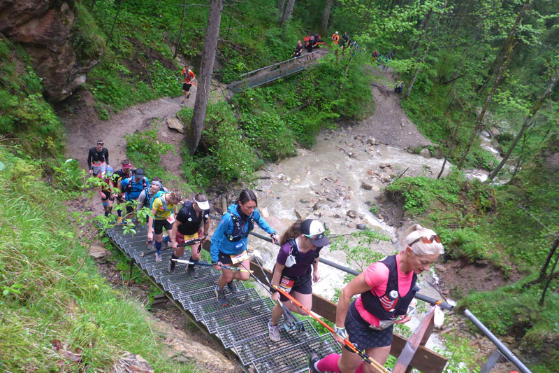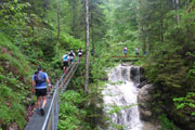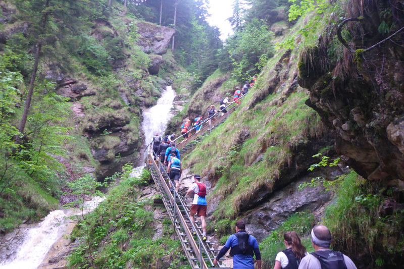 Das Highlight und so was wie der optische Aufmacher für den Mountainman Nesselwang ist der Wasserfallweg, ihn erreichen wir nach 2 km, somit liegt er bereits am Anfang unserer Tour und so kann man ihn auch wirklich genießen finde ich. Bei der Veranstaltung 2020 durften wir ihn zweimal im Rahmen des XL laufen, beim zweiten Mal auf der linken Seite – der normalerweise für die Hunde und Nichtschwindelfreien geplant ist – so nach etwa 30 km, da war das nicht mehr das reinste Vergnügen und zumindest für mich eine zähe Angelegenheit.