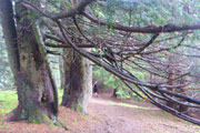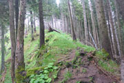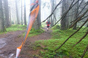 Der relativ gut passierbare Weg wird weiter oben immer steiler und herausfordernder, durchsetzt mit hohen Stufen und vielen Wurzeln. Leider verschlechtert sich auch das Wetter hier oben spürbar, wir erreichen die Wolkengrenze und verschwinden im Nebel, bei deutlich frischeren Temperaturen. Nach gut 4 km trennt sich die XL-Strecke von der L und M. Während es für uns auf einer Forststraße wieder abwärts geht, führen die beiden anderen weiter direkt zum Sportheim Böck.