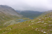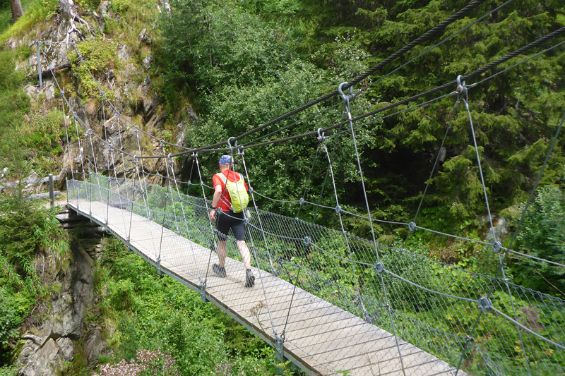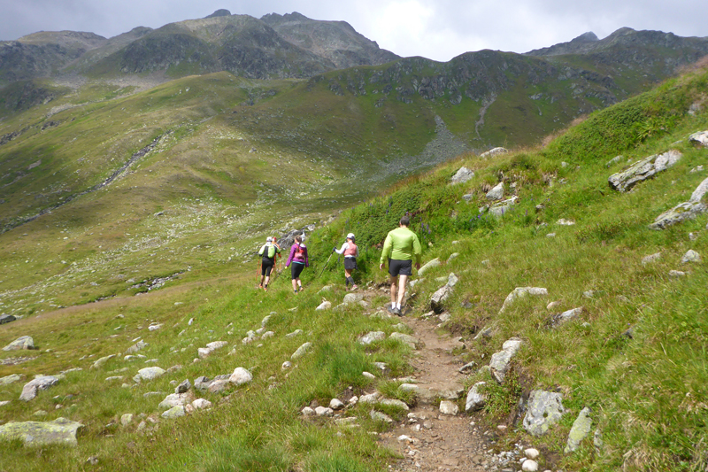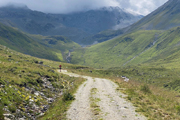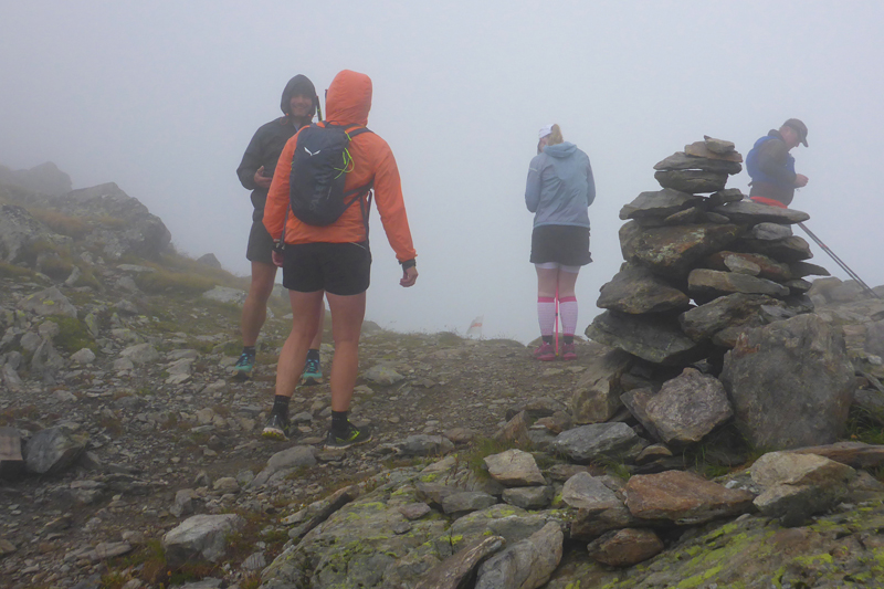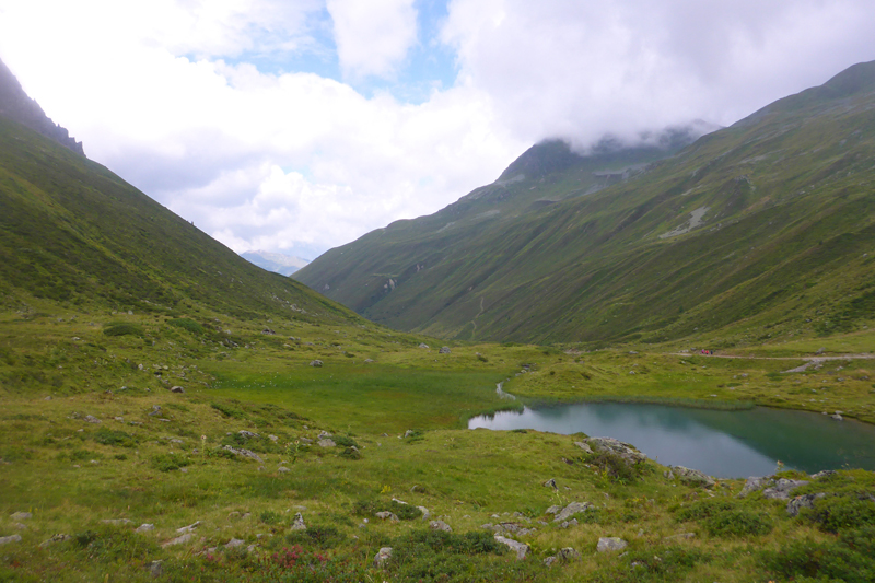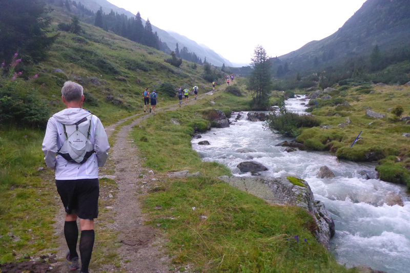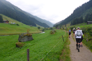 Mäßig steigend führt unsere Route hinein ins Dischmatal. Der Weg schlängelt sich meist neben dem Dischmabach durch das enge Hochtal, dem nördlichsten der Davoser Seitentäler, das sich nach Osten in Richtung Engadin erstreckt. Läuferisch ist das alles recht unspektakulär und gut zu laufen. Aber die zauberhafte Landschaft begeistert ungemein Leider fehlt uns etwas die Sicht zu den umliegenden 3000ern. Die Wolken hängen sehr tief im Tal.