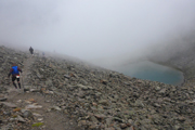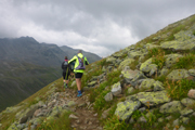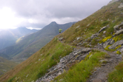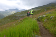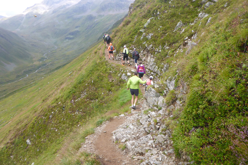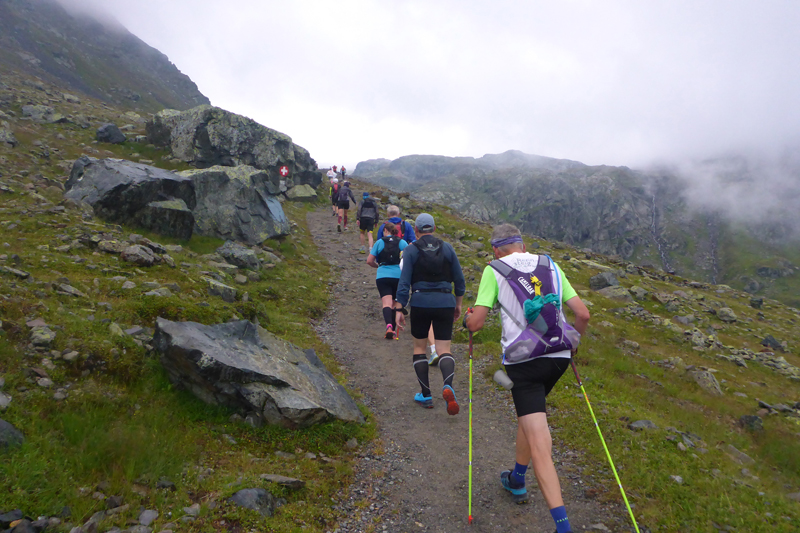 Ganz allmählich gewinnen wir an Höhe. Nach der Wasserstelle wird der Weg deutlich schmaler und trailiger. Wenn wir dazu jetzt noch Sonne hätten… Aber es kommt genau andersrum, kurz vor Dürrboden fallen die ersten Regentropfen. Für die Schnelleren, die sich bereits auf dem Scalettapass befinden, fällt das Nass in Form von Schnee vom Himmel.