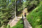 An der Station Teufi (km 7) können wir erstmals Wasser aufnehmen, ansonsten wird noch nichts angeboten. Wer anderen Bedürfnissen nachgehen muss, für den sind am Streckenrand auch immer wieder mal Dixihäuschen aufgestellt worden. Manche befinden sich sogar in uriger Holzverkleidung.