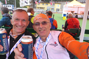 Neben der Tartanbahn ist ein großes Veranstaltungszelt aufgebaut, wo wir unsere Startnummern abholen können. Im Starterbeutel befindet sich auch ein Faltbecher, der auf der Strecke mitzuführen ist, Getränke in Einwegbechern werden beim Lauf nicht mehr ausgeben. Ab 17 Uhr können wir im Zelt unseren Pasta-Party-Gutschein einlösen, während im Freien schon erste Tropfen vom Himmel fallen. Dazu findet insbesondere für die jüngeren Teilnehmer*innen ein Konzert statt und danach gibt es noch Magische Unterhaltung mit dem Zauberkünstler Tino Plaz. Der macht das ganz witzig und hat die Kinder und auch mich ganz schnell auf seiner Seite mit durchaus anspruchsvollen Illusionen.