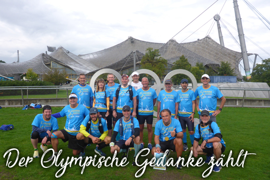 So ging es dann auch schnell los und mir blieb wenigstens keine Zeit mir groß Gedanken zu machen, ob das heute wirklich gut gehen kann. Andreas zählte kurz von Zehn rückwärts und dann setzte sich das Feld auch schon in Bewegung. Jürgen und ich blieben natürlich gleich mal ganz hinten und verloren schnell den Anschluss. Doch das war o.k. und ja auch so geplant. Unter den Glasdächern des Olympiastadions liefen wir noch kurz durch den Park in Richtung Olympisches Dorf. Am Ende des Parks suchten wir uns jeweils noch schnell einen Baum und mussten dann am Olympia-Einkaufzentrum feststellen, dass wir nicht einmal mehr Sichtkontakt zum Ende des Feldes hatten.