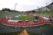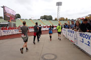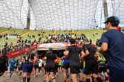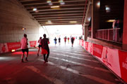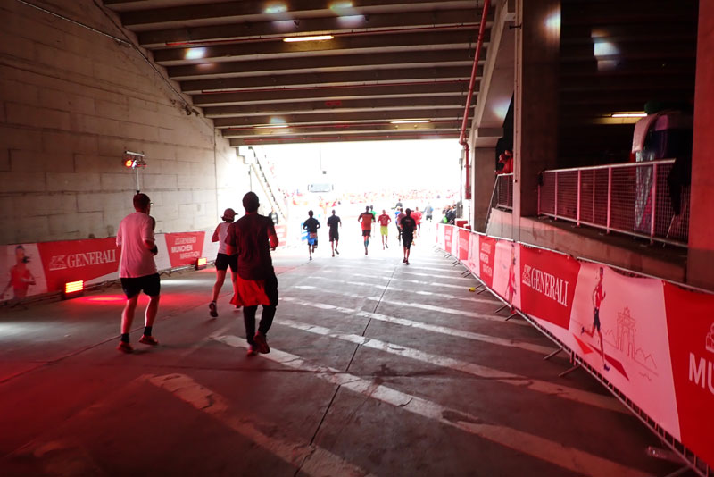 Es sind noch zehn Minuten bis zum Start. Jürgen und ich machen uns in Richtung Südtribüne auf, von wo aus wir Zugang zum Startbereich haben. Die unterschiedlichen Startblöcke werden in markierten Kanälen die Treppe hinabgeschickt, was durch Ordner kontrolliert wird. Jürgen und ich erkennen eine Chance, ein paar Extraminuten für uns herauszuholen. Bei der Nachmeldung mussten wir keine Finisherzeit angeben, so dass auch unsere Startnummer mit keinem Block markiert ist. Wir nehmen den Abgang für den Block B, der avisierten Laufzeiten von unter vier Stunden vorbehalten ist. Auf Nachfrage erklären wir dem Ordner, dass sich eine Zeit von unter vier Stunden für uns locker ausgehen sollte, was dieser, ohne Zweifel erkennen zu lassen, akzeptierte.