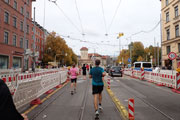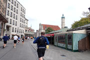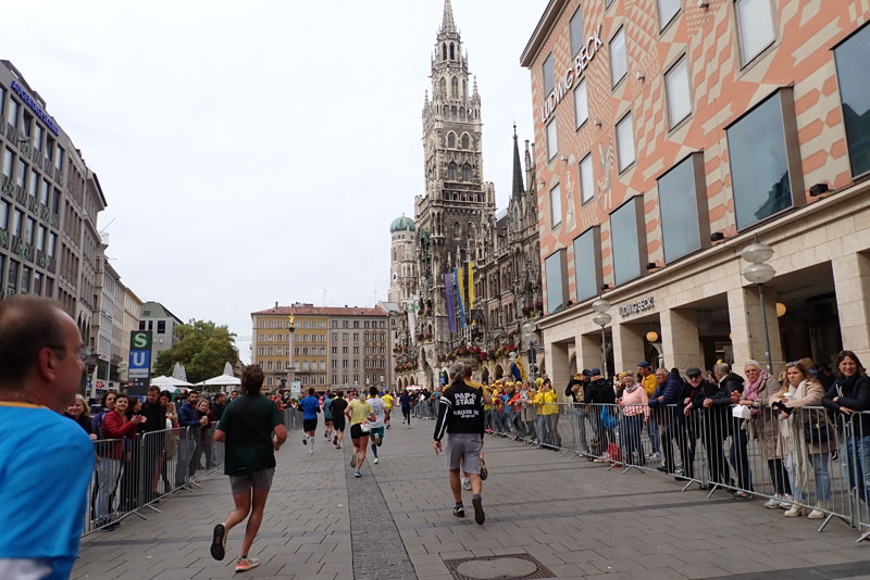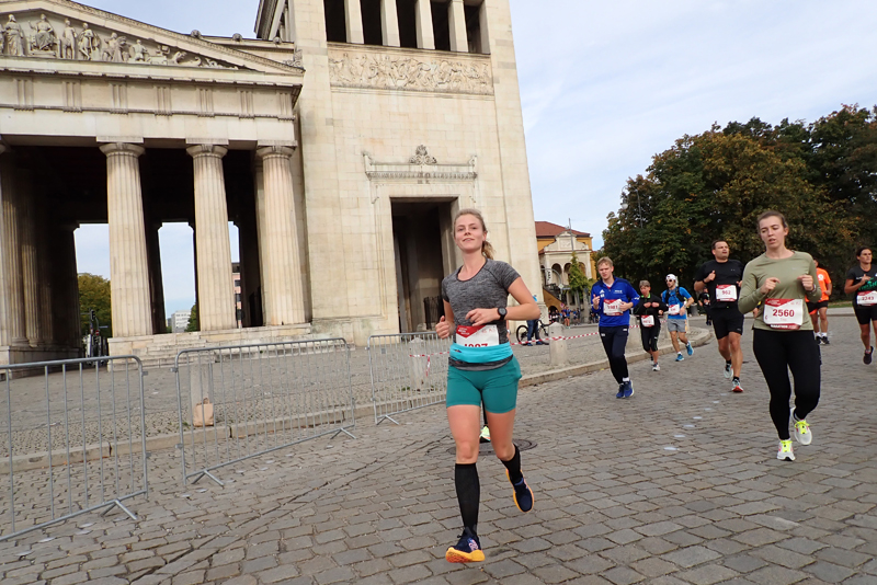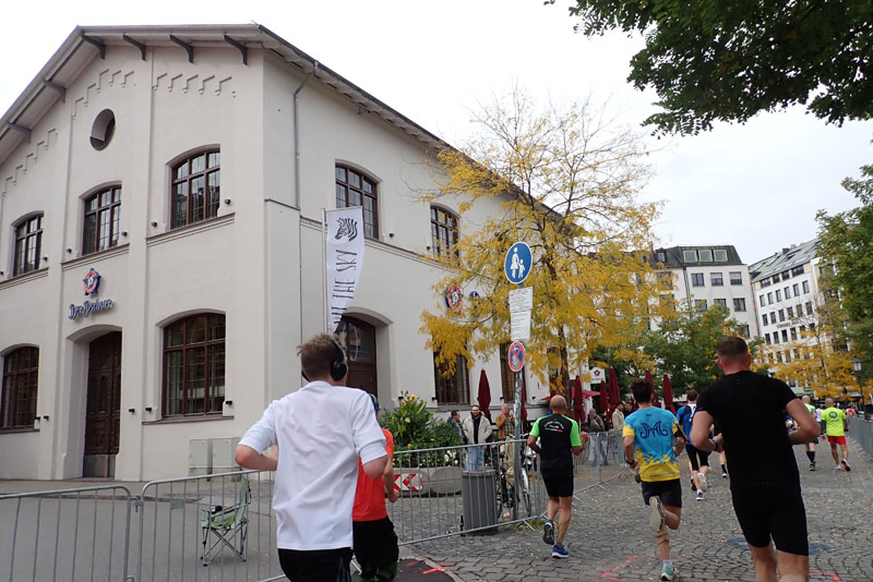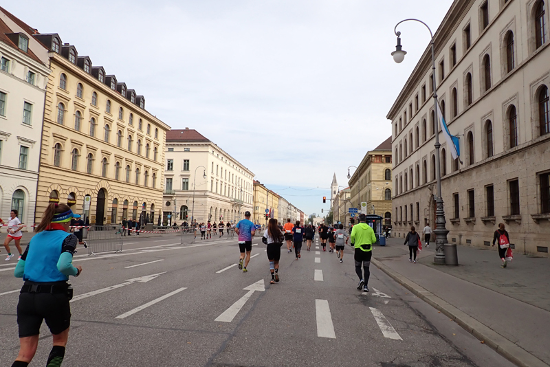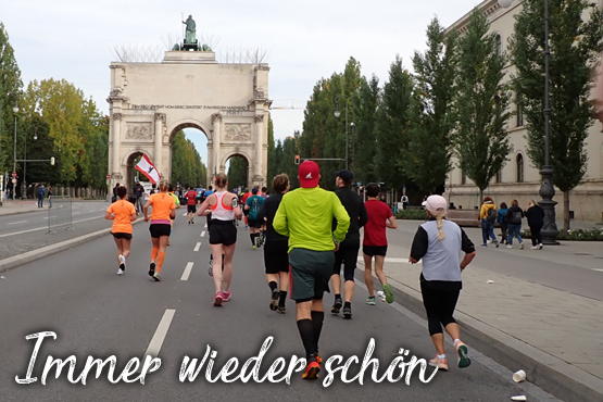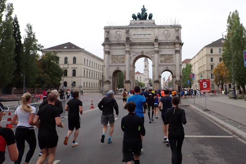 Wir laufen also durch Schwabing in Richtung Leopoldstraße, die für mich immer das erste Highlight des München Marathons ist. Historische Gebäude und Kirchen säumen die breite Straße, vor uns erhebt sich das Siegestor und die schnelleren Läufer, wie auch die führenden Damen kommen uns entgegen. Zahlreiche Zuschauer sind auch schon an der Strecke und machen ordentlich Stimmung. Dafür liebe ich diese Stadt und diesen Marathon. Jürgen und ich laufen winkend auf den Triumphbogen aus dem 18. Jahrhundert zu, denn für jedes „Lederhose“ wird natürlich auch brav gegrüßt. Kurz vor dem Odeonsplatz werden wir nach rechts weggeschickt.